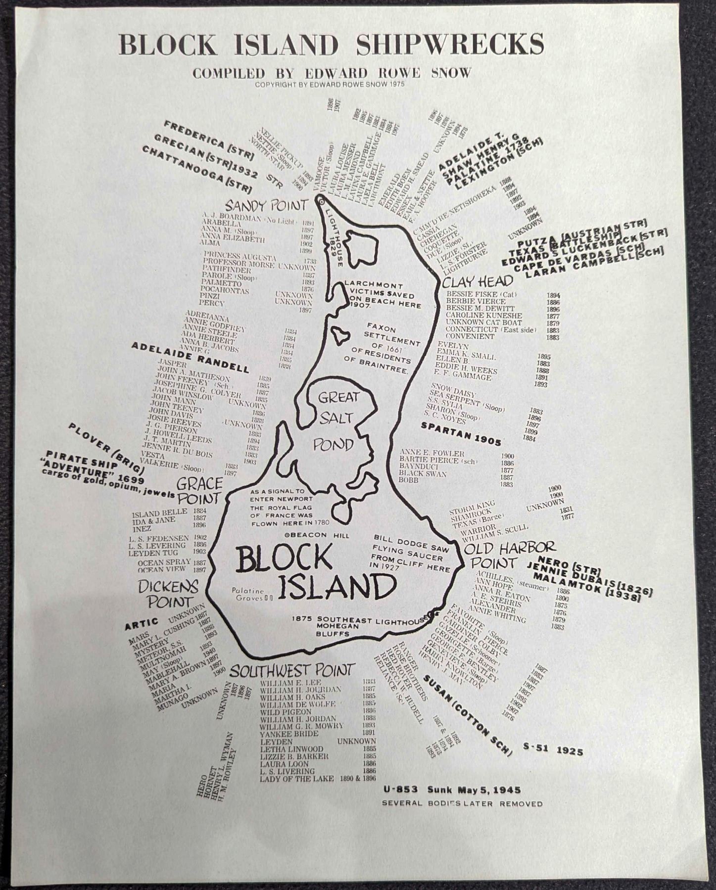 Snow, Edward Rowe. BLOCK ISLAND SHIPWRECKS. Edward Rowe Snow. 8.5x11. Winthrop. original printed paper. black on white. Fine. Scarce. Lot weight: 0 lbs 2oz. Subject(s): Shipwreck Maps.