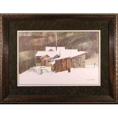 This remarkable quality giclee print is embellished by an ornate wooden frame of high caliber. The outline of the frame has a golden carved design that enhances warm hues of the watercolor. To further complement the giclee, a double matt of an elegant moss, green suede is used to complement the cool green hues and an inner crisp white for a sharp outline of ?Snow Covered Cabins?. The giclee and frame measures a total of 31? x 24?. Signed in the bottom right corner, this ?Snow Covered Cabin? is an example of artistic genius. This giclee will increase in value and is an extraordinary ...
