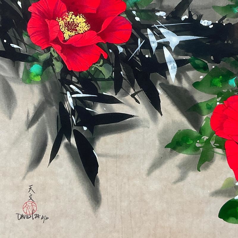 "Snow Fire Roses" is a limited edition serigraph on paper by David Lee, hand signed by the artist. Includes Letter of Authenticity. Measures approx. 28" x 21" (image).