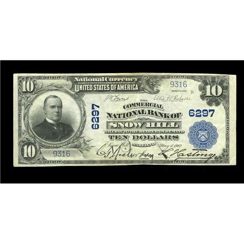 <B>Snow Hill, MD</B></I> - $10 1902 Plain Back Fr. 624 <B>The Commercial NB</B></I> Ch. # 6297<BR>A lovely example from this well collected community which is tied for finest known among the large notes from here listed in the census. Pen signed <B>Extremely Fine-About Uncirculated,</B></I> a premium example with great eye appeal.
