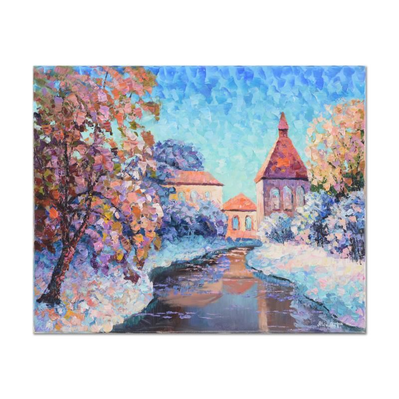 "Snow In the Village" is an original oil painting on stretched canvas by Alexander Antanenka, hand signed by the artist. Includes Certificate of Authenticity. Measures approx. 30" x 24" (image).