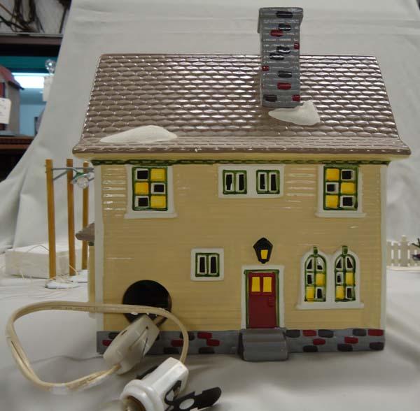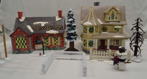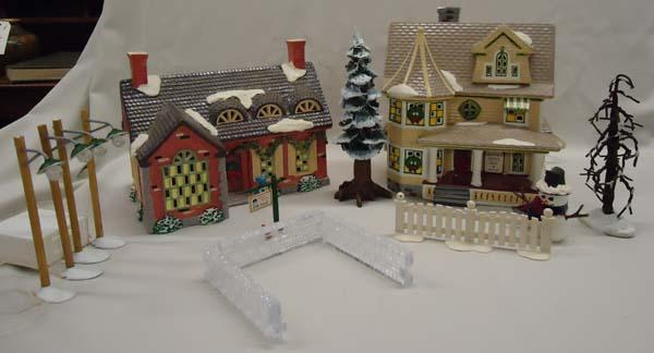 Snow Village Ceramic Houses Plus. 2 Ceramic house with lights, largest measures approx. 9''H x 8 1/2''L x 6 1/2''D. 2 trees, snowman, ice crystal walls, street lamps. SHI $60.