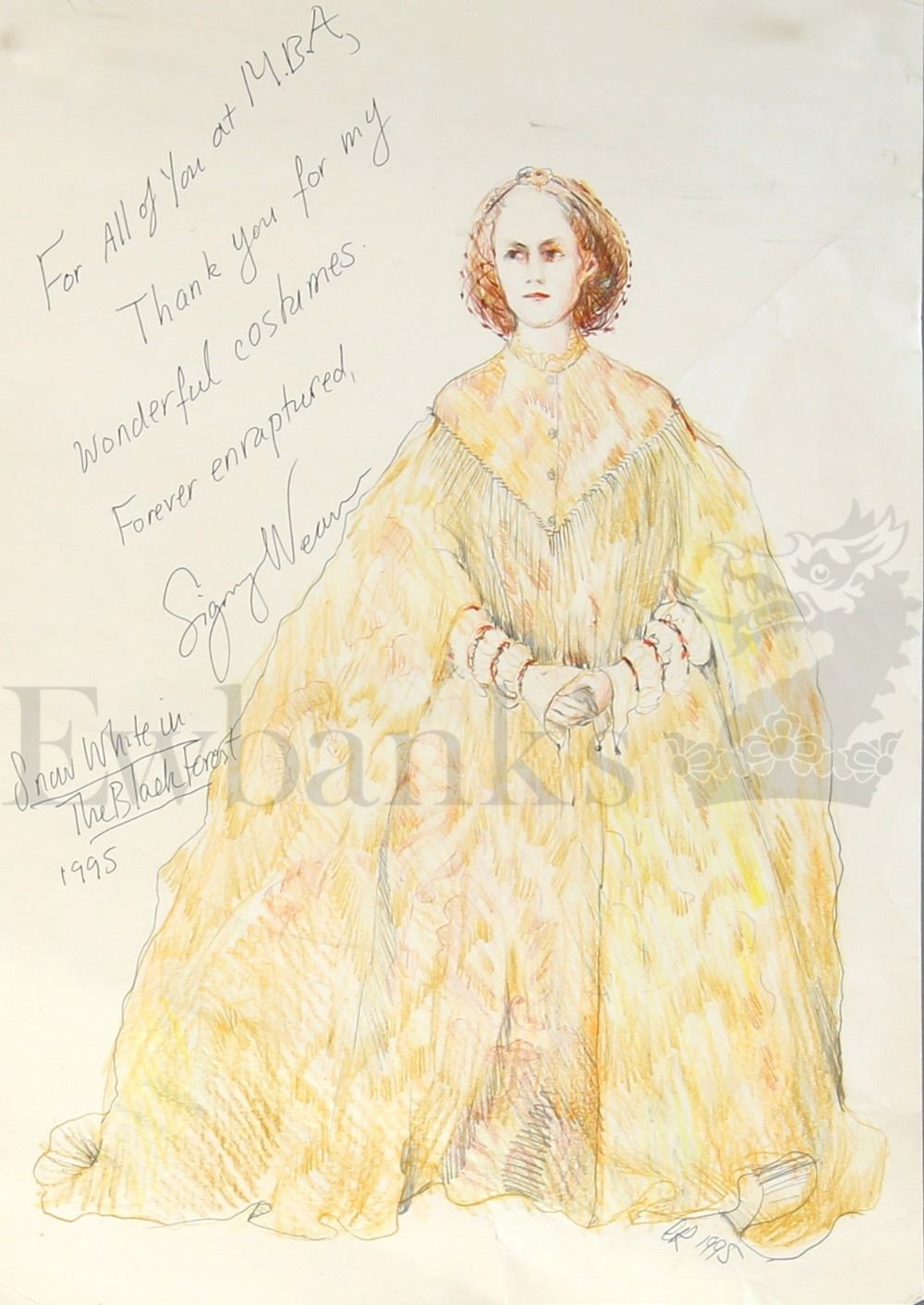 † Snow White A tale of Terror (1997) An original hand drawn costume design for Sigourney Weaver in her leading role as 'Claudia Hoffman'. Executed in pencil and pastels by Weaver's personal costume designer for the film, Charles Knode, and initialed and dated by him. Sigourney Weaver has added a signed hand written note of thanks to the costumiers on production to the left top corner of the design. Please note that VAT is payable on top of the hammer price at 20% in addition to standard buyers premium inc. VAT for this lot.