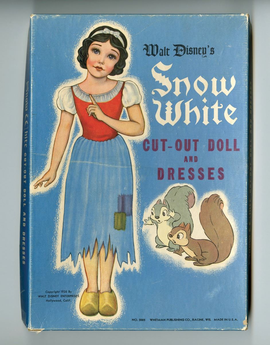 (Whitman, 1938) This beautiful boxed set contains a paper doll for each of the seven dwarfs and Snow White. Also comes with (21) outfits and accessories, as well as a wooden base to display the doll. The items have already been cut out. Box measures 10"x7"x1". In very good used condition, with some wear to the box.