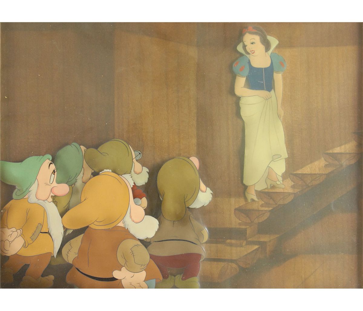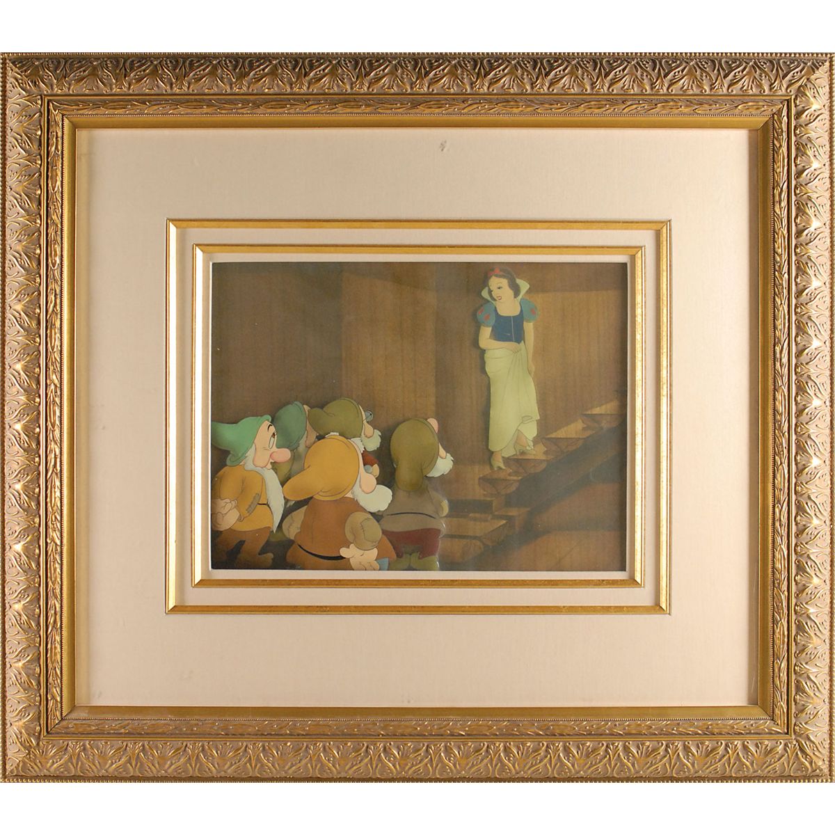 (Walt Disney Studios, 1937) Original production cel featuring Snow White with Bashful, Happy, Doc, Sleepy, and Sneezy from Snow White and the Seven Dwarfs, showing Snow White on the steps looking down lovingly at her dwarf friends. The cels have been trimmed to image and applied to an airbrushed woodgrain background as prepared by Courvoisier Galleries for sale. Snow White image measures 2 x 6 and total dwarf image measures 7 x 5, with a mat opening of 12.5 x 9.25. This piece is also framed to an overall size of 25.75 x 22.5. In fine condition. A positively wonderfully assembled setup featuring both the princess in a full-length pose and the majority of the dwarfs, rarely seen in such a cel.