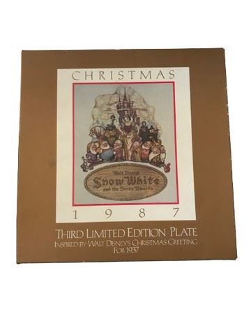 A Disney collectible Snow White plate from Christmas 1987. This artwork was inspired by Walt Disney’s Christmas greeting in 1937. Third edition. Limited to 10,000 pieces. Designed exclusively for Disneyland and Walt Disney World. In original box.