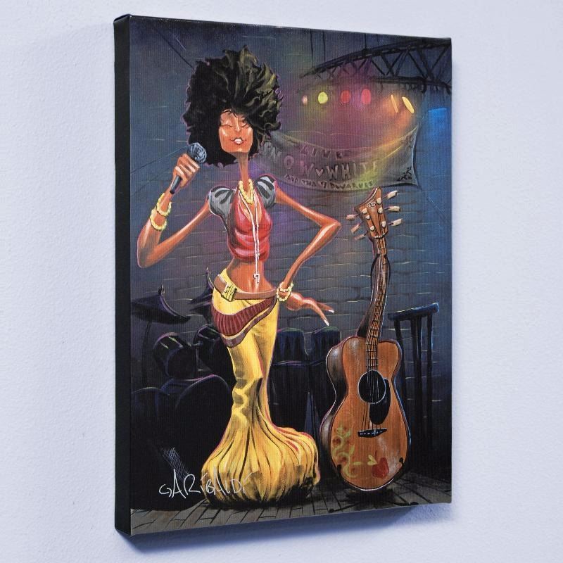 Combining his passions for music and art, David Garibaldi creates visual poetry. "Snow White" is a limited edition giclee on stretched canvas, CC numbered from the miniature series and bearing the artist's authorized signature. This piece is gallery wrapped and ready to hang. Includes Certificate of Authenticity! Measures approx. 12" x 16" (image). Retail Price $150.00. PRICE INCUDES FREE SHIPPING IN THE U.S. - SHIPPING WILL BE ADDED TO YOUR INVOICE FOR ALL BUYERS OUTSIDE OF THE U.S.