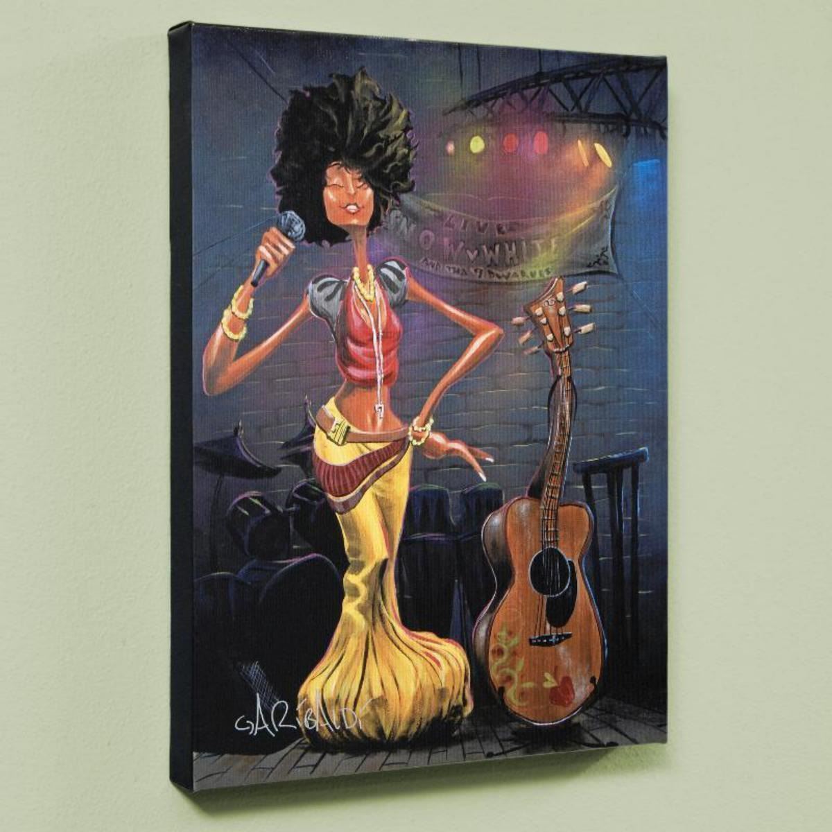Combining his passions for music and art, David Garibaldi creates visual poetry. "Snow White" is a limited edition giclee on stretched canvas, E numbered and bearing the artist's authorized signature. This piece comes gallery wrapped. Includes Letter of Authenticity. Measures approx. 27" x 36" (image). Reference #: 237331.