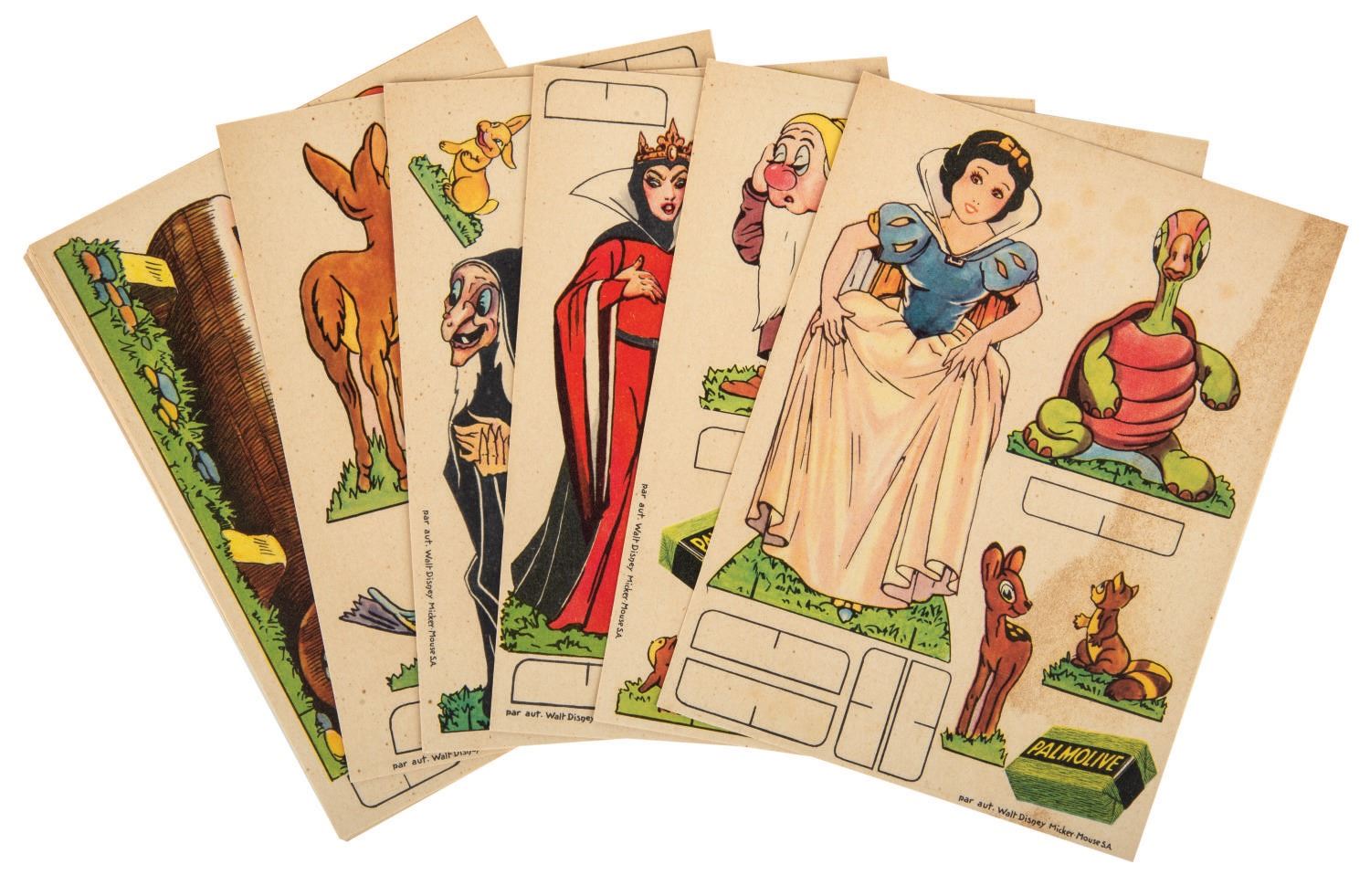 (Palmolive, 1938-1939) A rare set of (12) cards of cut-out figures from "Snow White and the Seven Dwarfs" with envelope, released by Palmolive soap of Belgium. Every character in the film is represented, except for the Queen's raven. This set was available with the purchase of a special 12-pack of soap bars. The (12) 4.75"x6.25" cards are in very good condition, with (2) of them exhibiting spotting that includes figures of woodland animals. The 5"x6.75" envelope is in very good condition with light spotting.