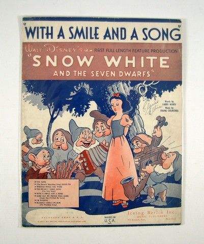 Snow White Seven Dwarfs Original Sheet Music - From the classic movie that changed the course of animation forever, Disney's "Snow White and The Seven Dwarfs" (1937) comes this Original Sheet Music from Irving Berlin, Inc Music Publishers. This is the music for "With A Smile And A Song". It is in Good Condition. (Note the original owner's name is hand written on the cover).