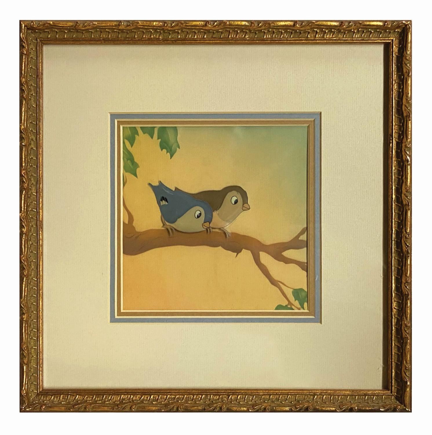 (Disney, 1937) An original hand-painted nitrate production cel from the first Walt Disney animated feature, Snow White and the Seven Dwarfs. Depicting a pair of song birds, the trimmed cel is framed over an original water color painting of a tree branch. The piece retains a pair of Walt Disney labels, photocopies of which are applied to the frame backing. Measuring 5.5"x5.5" with an image size of 3"x2" visible through the ornate 11.75"x11.75" gold-painted molded wood frame, the cel remains in good condition with some minor lifting and waviness from age.