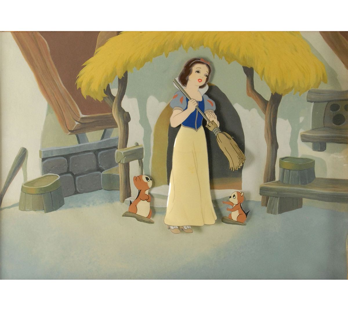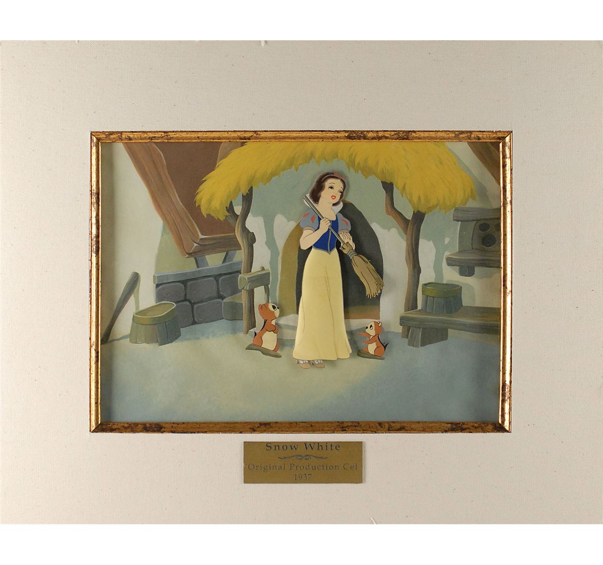 (Walt Disney Studios, 1937) Original production cel featuring Snow White and two chipmunks from Snow White and the Seven Dwarfs. The cel is placed on a hand-painted custom prepared background, done at a later date, which shows the outside of the dwarfs’ cottage. Snow White is trimmed to a size of 2.5 x 6 and affixed to a cel bearing images of two small chipmunks, with a mat opening of 11.75 x 8.5. Overall size of the cloth mat measures 18 x 14.5 with a small plaque affixed to the mat. In fine condition, with Snow White cel partially detached and expected light rippling. An attractive and colorful display from Disney’s first full-length animated feature.