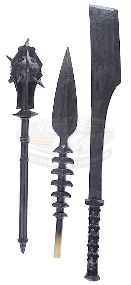 (Universal Pictures, 2012) This set of prop weapons were custom-made by the production for use by various actors during filming. The prop spear tip is constructed of hard foam and plastic, painted black, and measures 30.25" in length. The prop mace is constructed of hard rubber over metal, painted black, and measures 32" in length. The prop sword is constructed of hard rubber over metal, painted black and measures 37.5" in length. Wear from use is present.