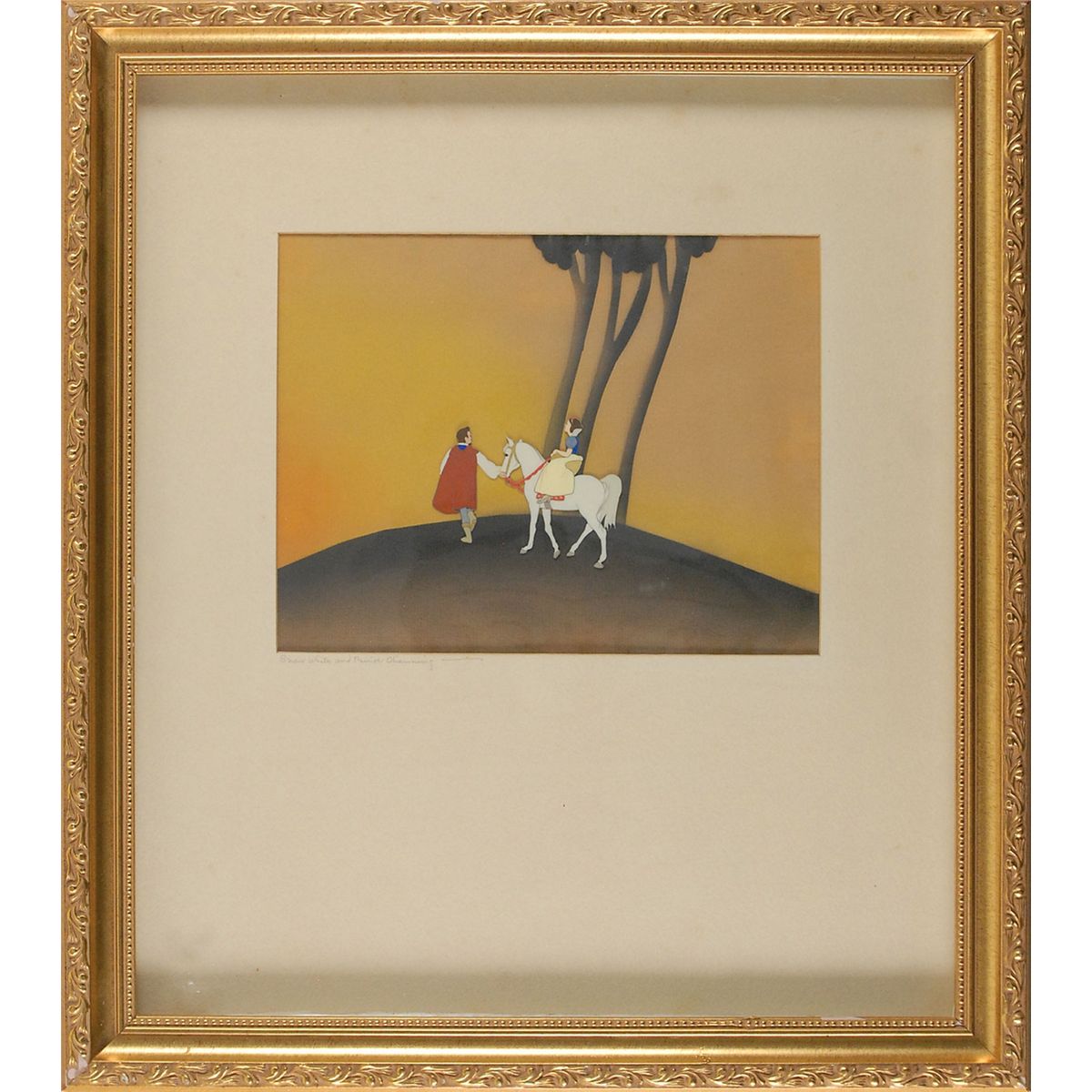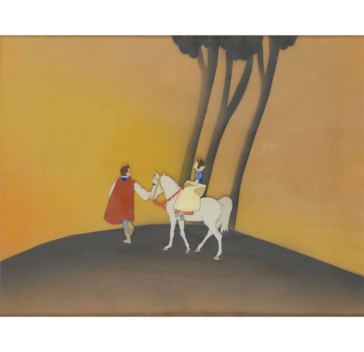 (Walt Disney Studios, 1937) Original production cel featuring Snow White and Prince Charming from Snow White and the Seven Dwarfs. The cel has been applied to an airbrushed background as prepared by the Disney Studio to be sold at the Courvoisier Galleries. Image measures 3 x 2.75, with a mat opening of 9 x 7. This piece is also framed to an overall size of 16 x 18. The piece has the original Disney Courvoisier Galleries label on the reverse. A gorgeous cel from the finale of the film setup to show the romantic partners at a distance, evoking the feeling of the couple walking ‘off into the sunset’ in classic fashion.