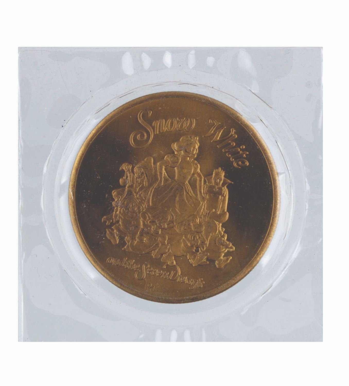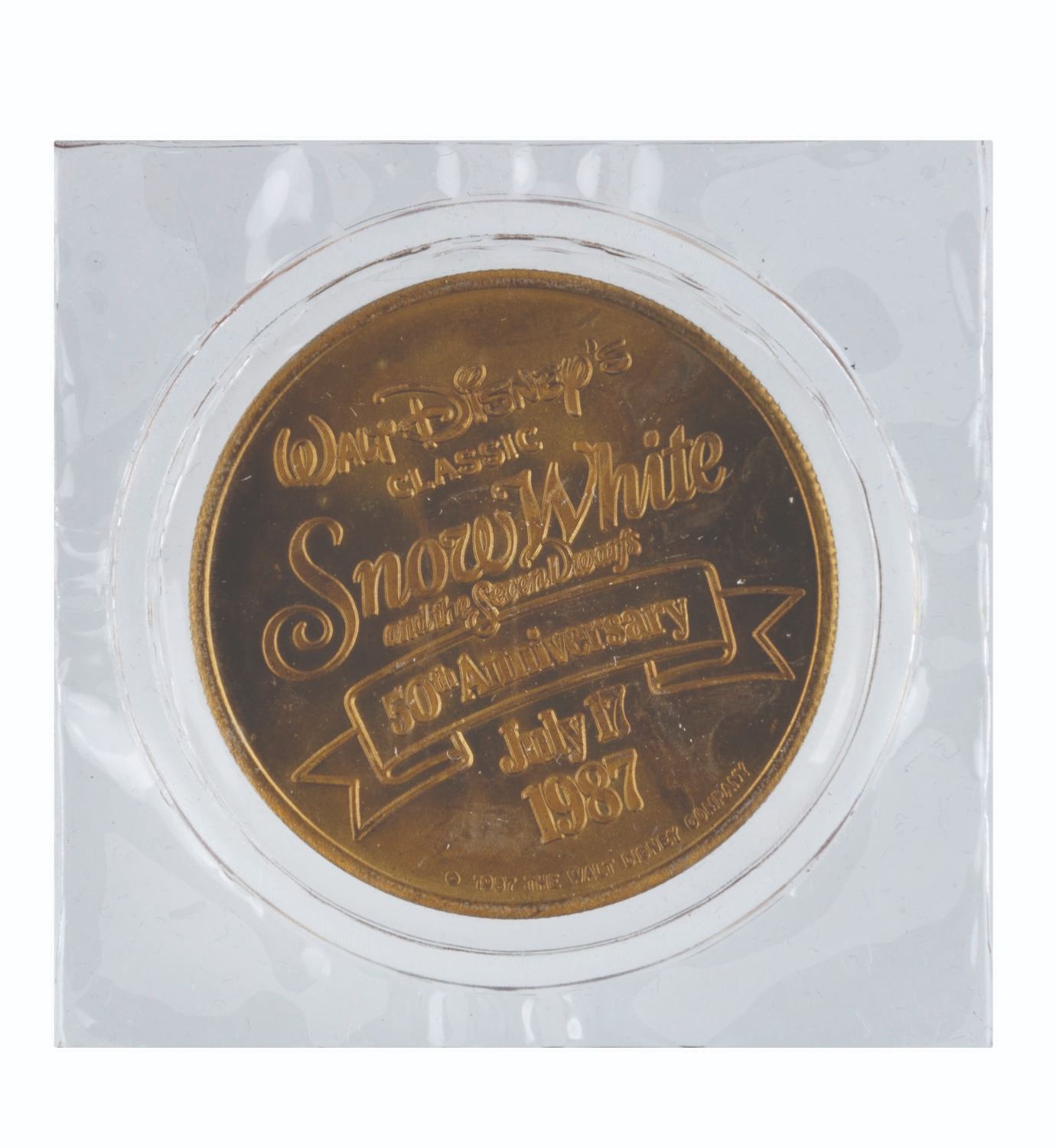 (Disney, 1987) A bronze medallion commemorating the 50th anniversary of "Snow White and the Seven Dwarfs" in 1987. Measuring 1.5" in diameter, the medallion is in very good condition.