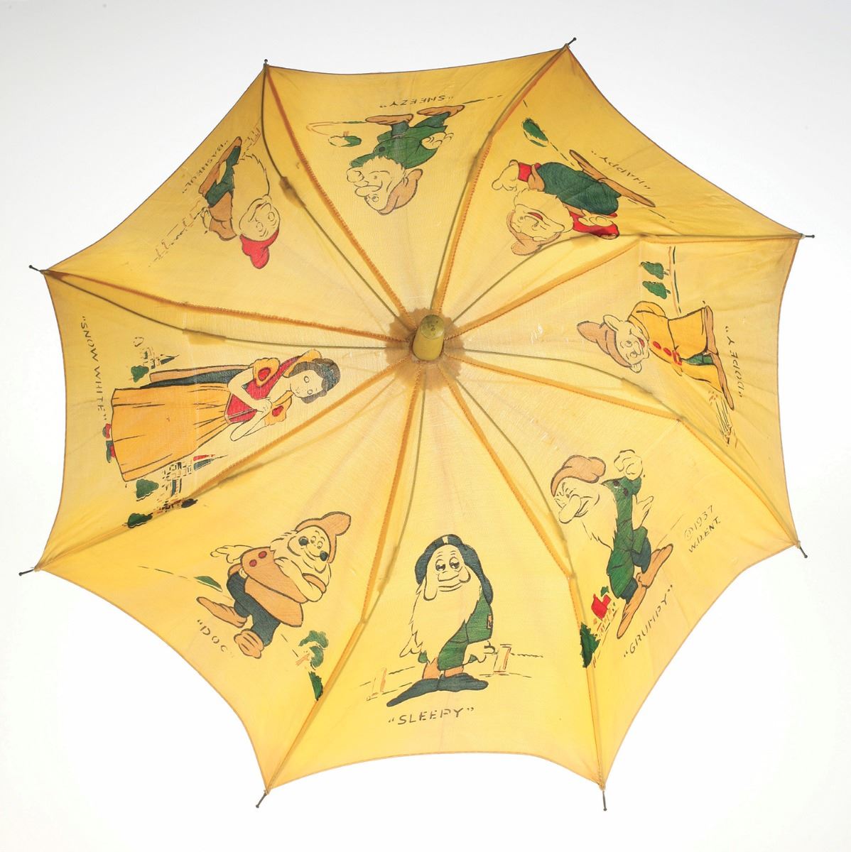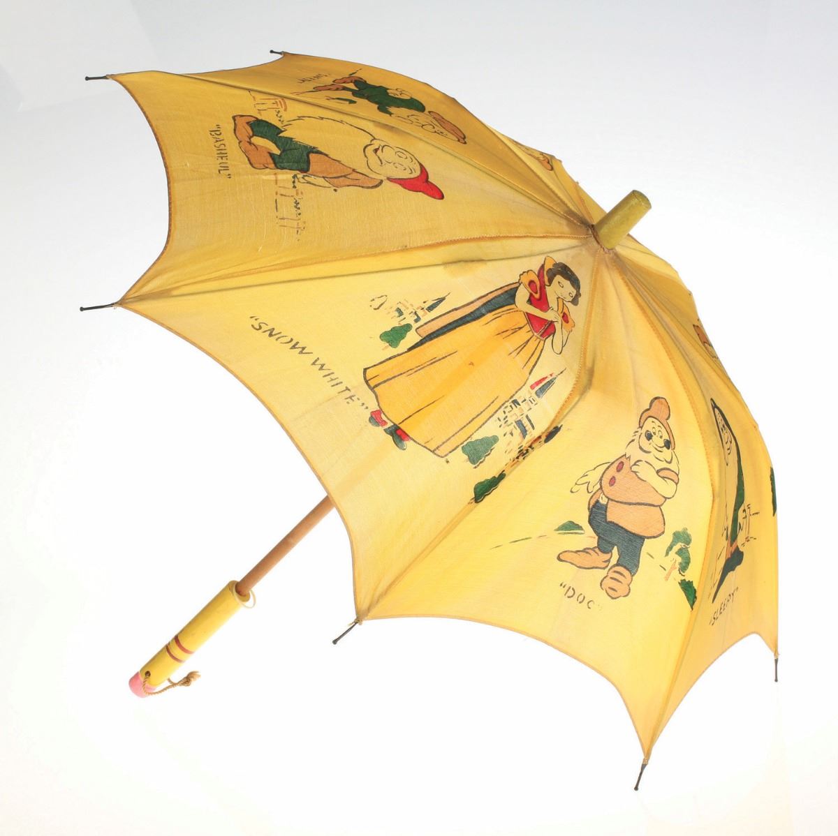 (c.1937) Beautiful "Snow White and the Seven Dwarfs" themed umbrella. Made in Japan and measuring 21" in diameter opened and 19.25" tall. In very good functional condition with some discoloration to the fabric.