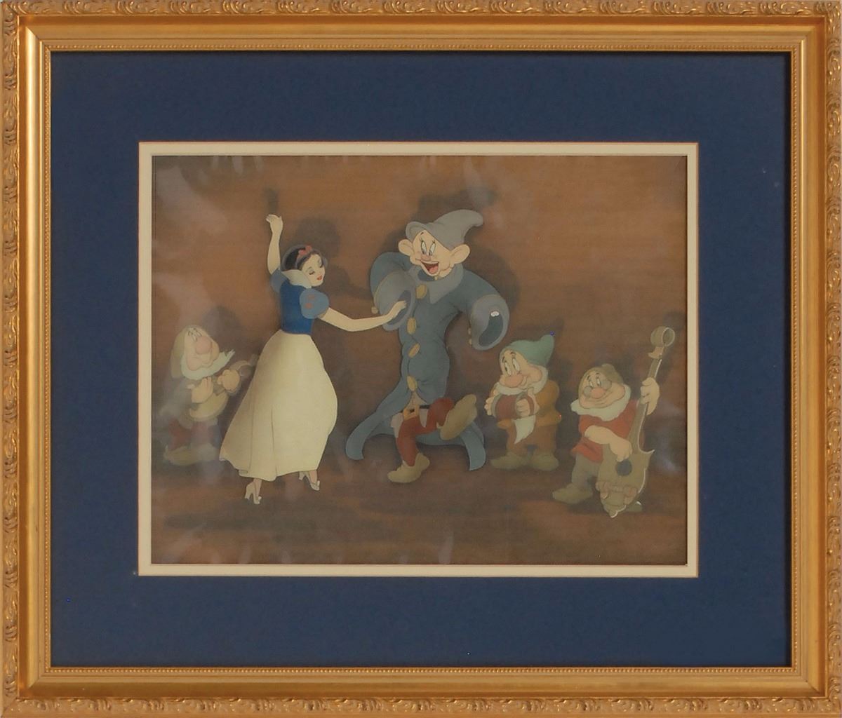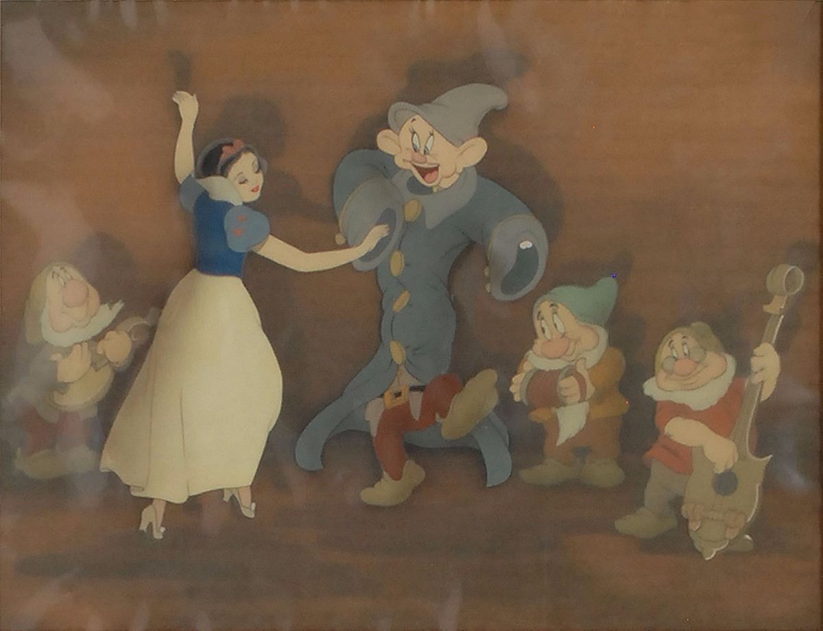 (Disney, 1937) Original production cel featuring Snow White, Dopey, Doc, Bashful, and Sneezy from Snow White and the Seven Dwarfs, portraying the famous dance scene after dinner, with Snow White dancing with Dopey, Doc playing upright bass, Bashful on the concertina, and Sneezy strumming a mandolin. The cel has been trimmed and applied to a woodgrain background as prepared by Courvoisier Galleries for sale. Image measures 12 x 7, with a mat opening of 13 x 10. Double-matted and framed to an overall size of 21 x 18. In fine condition. A wonderful, sought-after scene with nice large images—truly a museum-quality piece.