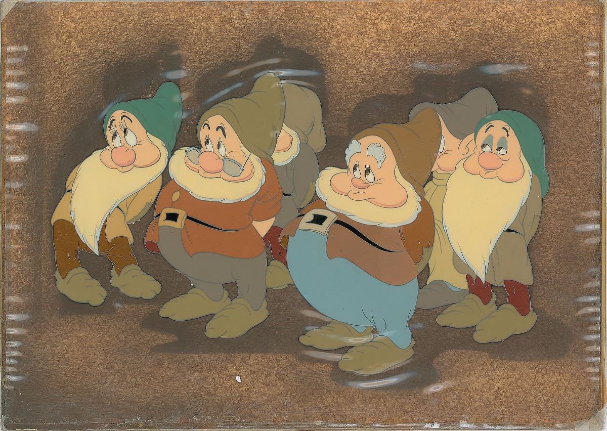 (Disney, 1937) Original production cel featuring Bashful, Doc, Sneezy, Happy, Dopey, and Sleepy from Snow White and the Seven Dwarfs, showing six of the diminutive title characters looking sheepish. The cel has been trimmed and applied to an airbrushed background as prepared by Courvoisier Galleries for sale. Image measures 10 x 6.5, with overall dimensions of 12.75 x 9. The piece has the original Disney Courvoisier Galleries label on the reverse. Perfectly restored to fine condition. A simply beautiful production cel from an iconic film.