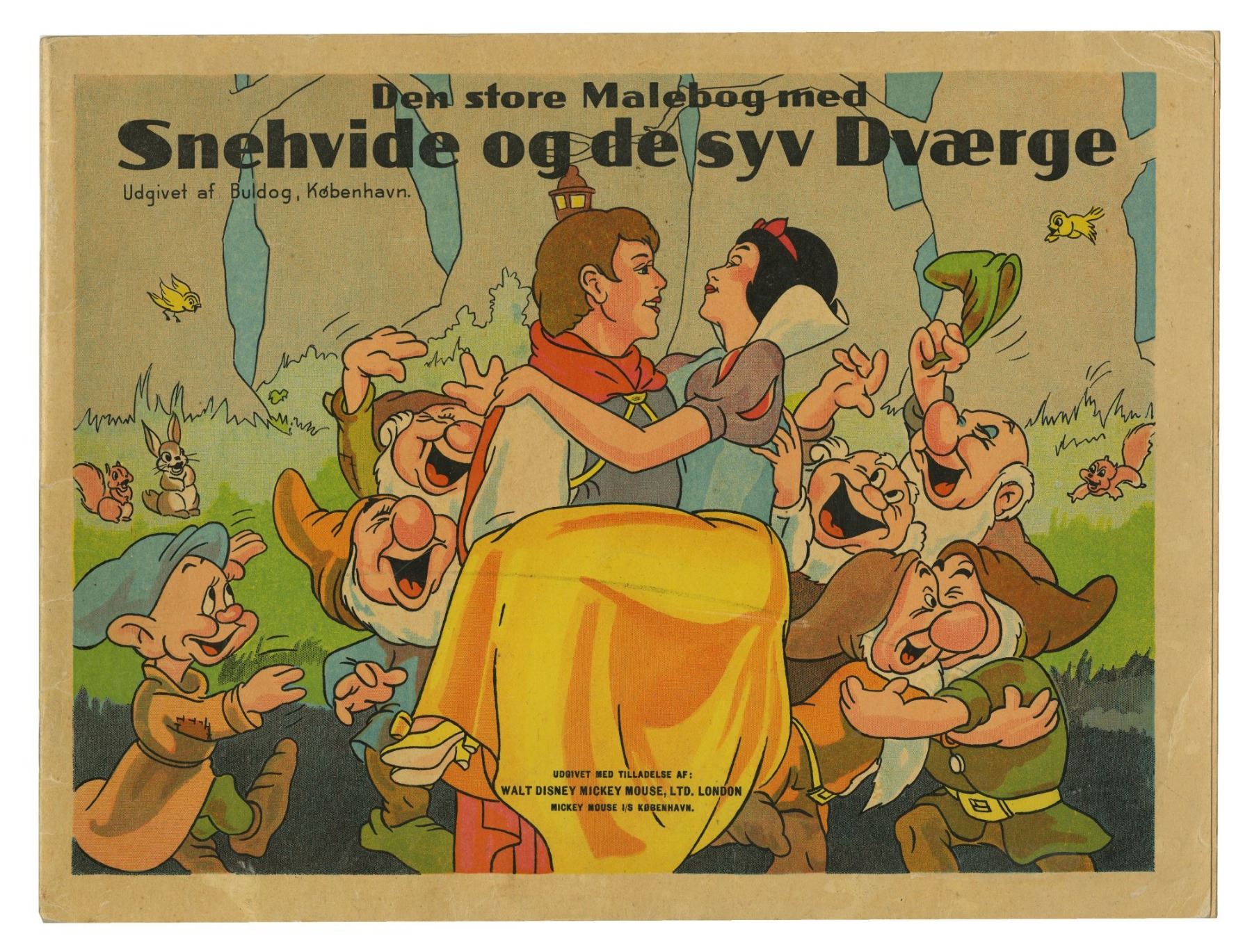 (Walt Disney Studios, c.1938) A Danish coloring book featuring scenes inspired by Walt Disney's Snow White and the Seven Dwarfs. Inside are (8) scenes to color, each alongside a matching printed color version which shows the reader the correct colors to use. Measuring 8.75"x11.5", the book is in fair condition with some wear throughout from use, and most of the pages having some colored areas.
