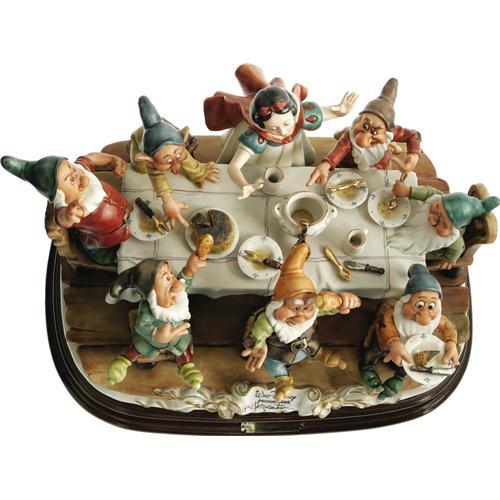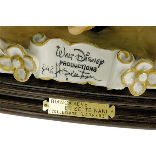 <B>Snow White and the Seven Dwarfs - Limited Edition Porcelain Sculpture 10/1000 (House of Lorenz, Circa 1980s).</B></I> Offered here is a limited edition porcelain masterpiece from the Walt Disney Studios. "Having Dinner - Snow White and the Seven Dwarfs" has overwhelming intricacy and incredible likenesses to the characters from the 1937 animated film. The scene is full of movement and action as Snow White tries to maintain order among the misbehaving dwarfs. Lorenz product #LZD-53 was originally issued in 1983 and was slated for a 2,500 piece production run but the molds were destroyed in 1992 after reaching only 1,000 limited edition pieces. Rendered in the Capodimonte style by master sculptor Enzo Arzenton (who retired in 1999), this beautiful piece, with its realistic detail, was made in Italy and features the "Crowned N" logo formerly reserved only for European royalty. The bottom of the wooden base notes "No. 10". This piece appears to be from the initial casting session and has different colored glazes than the later releases making this item very desirable. Also note that there was a slight change to the face of Snow White in the later castings. Dimensions of the piece are 11" X 18.25" X 13.5". Doc's wire-rim glasses are missing, otherwise the condition of the sculpture is Excellent. <BR><BR><B>Important notice:</B> Heritage usually auctions material at the rate of 200-250 lots per hour. On some occasions eBay Live bid software or the Internet may not be able to keep up with the pace of the auction. We recommend placing a realistic absentee bid now as insurance to avoid disappointment. Occasionally the auctioneer may eliminate or reject an eBay Live bid, and the auctioneer may also reopen a lot after the close of the eBay live bidding (usually because we missed an audience bid), and may reject your bid even if it shows you as the winning bidder. By bidding via eBay Live, you agree that Heritage may award the lot to another bidder at its sole discretion under the circumstances described above or any other reasonable circumstances. Since eBay bids are not shown to us until we open the lot on the floor, we treat those bids just like floor bids. In most cases the floor responds before the eBay bid is presented to us, due to Internet lag time, so for consistency we have made it a policy that floor bids are always considered first over tie eBay live bids. Also please note that all Heritage lots purchased through eBay Live carry a 22.5% Buyer's Premium. Please make sure you read the Terms and Conditions before you bid. This lot is being auctioned in conjunction with a live floor auction by Heritage Auction Galleries. All final auction and invoice information will be supplied by Heritage Auction Galleries, and all other information should be considered preliminary. Lot:41001 <BR><BR><B>Winning Notification and Billing:</B> After the FINAL session in this auction is complete, Heritage will send e-mail and snail mail invoices. This process normally takes several days. All final auction and invoice information will be supplied by Heritage Auction Galleries, and all other information should be considered preliminary. <BR><BR>This auction will be conducted on a live auction floor and over the Internet through eBay Live. If you choose to place an absentee bid, please take a moment to <font color='#0000ff'><u><a href='http://pages.ebay.com/liveauctions/help/before/laabsentee.html'>learn how eBay Live absentee bidding works</a></u></font><font color='#000000'>