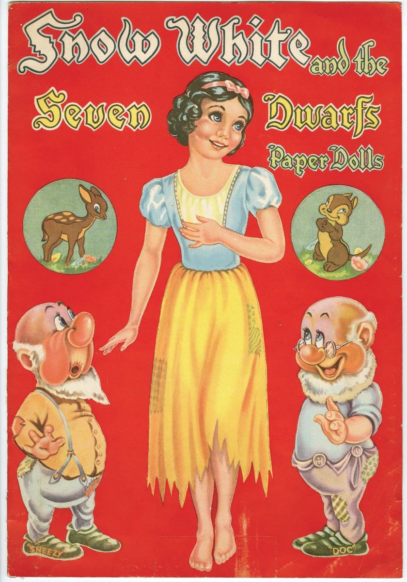 (Whitman, 1938) Beautiful Whitman published paper doll book featuring Snow White and all seven dwarfs. Book is unused with a portion of the back cover torn away (not affecting the dolls). Measures 17"x11.75". In good condition with some edge wear and some creased lower corners.