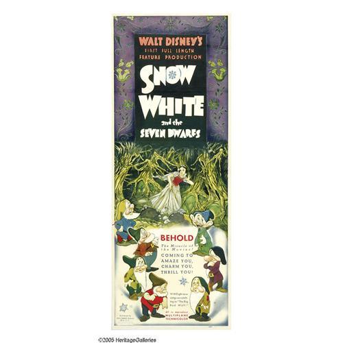 <B>Snow White and the Seven Dwarfs (RKO, 1937).</B></I> Insert (14" X 36"). Walt Disney had entertained the idea of producing a feature-length animated film for years and when financial troubles began to brew, Disney knew he had to come up with something new to save his company. He invested $1,500,000 and three years of hard work, along with the combined talents of 570 artists, into the production of this animation classic. The film was a huge success, earning $8,500,000 Depression-era dollars, that not only saved the company financially, but also laid the foundation for the animation empire that was to follow. The film was such "a significant screen innovation" that it was given a special Oscar (and seven tiny versions) in 1939. This insert has been paper backed to flatten the fold lines. There has been color touch-up to those fold lines as well as a horizontal crack/crease that runs under Disney's name at the top. Fine- on Paper.