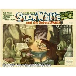 <B>Snow White and the Seven Dwarfs (RKO, 1937)</B></I> Lobby Card (11" X 14"). One of the most notable things about any animated Disney feature is how evil Disney's villains actually were. Well here's the ultimate villain lobby card. This is the only card from the original set to feature the evil Queen after she's turned herself into the old crone. Gustaf Tenggren, one of the pictures original art directors, executed the art on this card. Not only do animation collectors actively look for this card, but the horror collectors desire it as well. This scene routinely sells for far more than any other card in the set. Very Fine.