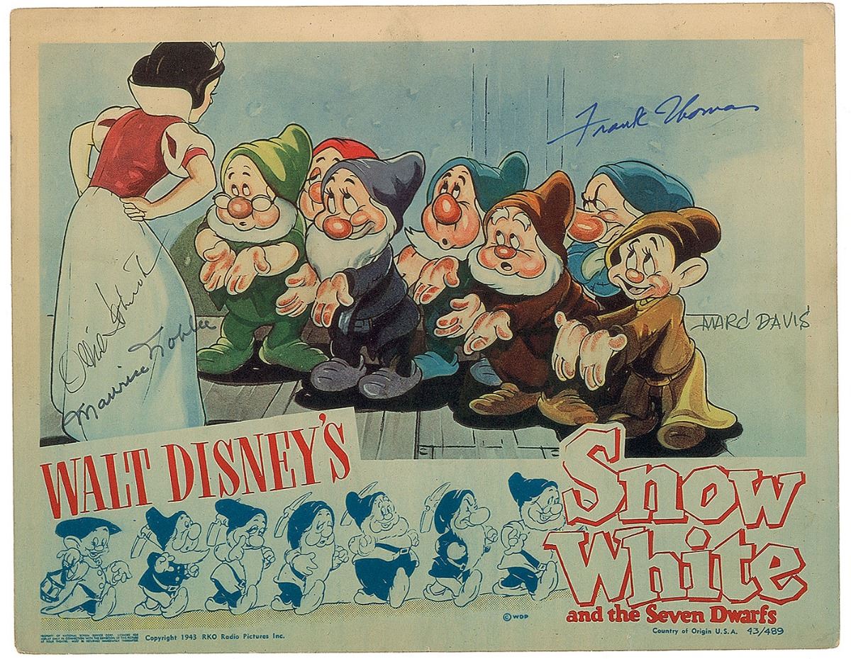Lobby card for a 1943 RKO Radio Pictures presentation of Walt Disney’s Snow White and the Seven Dwarfs, 14 x 11, signed in blue and black felt tip by Frank Thomas, Marc Davis, Ollie Johnston, and Maurice Noble. In very good to fine condition, with light overall soiling.