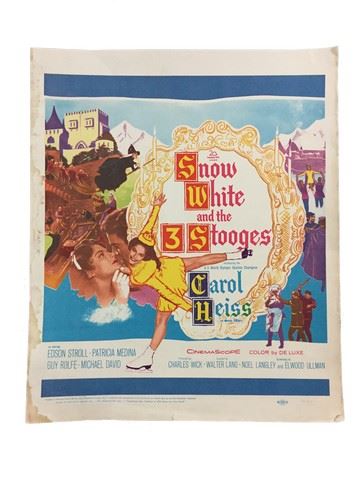 Snow White and the Three Stooges (Gold Key Entertainment, 1961). Window card printed on cardstock paper. Starring: Carol Heiss and the Three Stooges. There are fold lines, creases, stains, marks, holes and edge wear damage. Fine.(14" X 17").