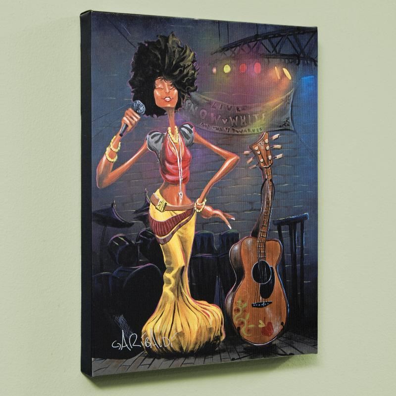 Combining his passions for music and art, David Garibaldi creates visual poetry. "Snow White" is a limited edition giclee on stretched canvas, E numbered and bearing the artist's authorized signature. This piece is gallery wrapped and ready to hang. Includes Certificate of Authenticity! Measures approx. 27" x 36" (image).