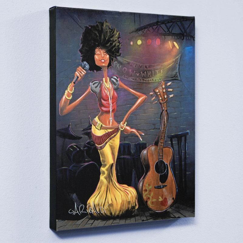 Combining his passions for music and art, David Garibaldi creates visual poetry. "Snow White" is a limited edition giclee on stretched canvas, CC numbered from the miniature series and bearing the artist's authorized signature. This piece is gallery wrapped and ready to hang. Includes Certificate of Authenticity! Measures approx. 12" x 16" (image).