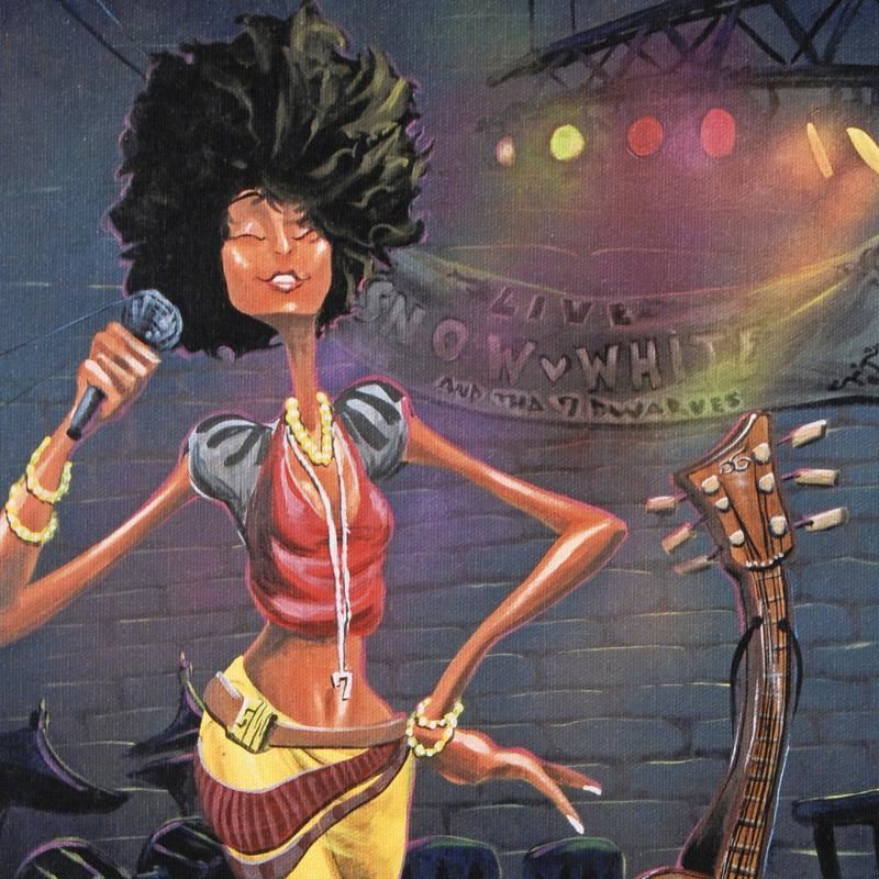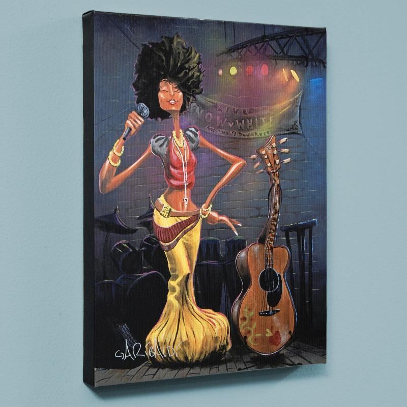 Combining his passions for music and art, David Garibaldi creates visual poetry. "Snow White" is a limited edition giclee on stretched canvas, AP numbered and bearing the artist's authorized signature. This piece comes gallery wrapped. Includes Certificate of Authenticity! Measures approx. 27" x 36" (image).