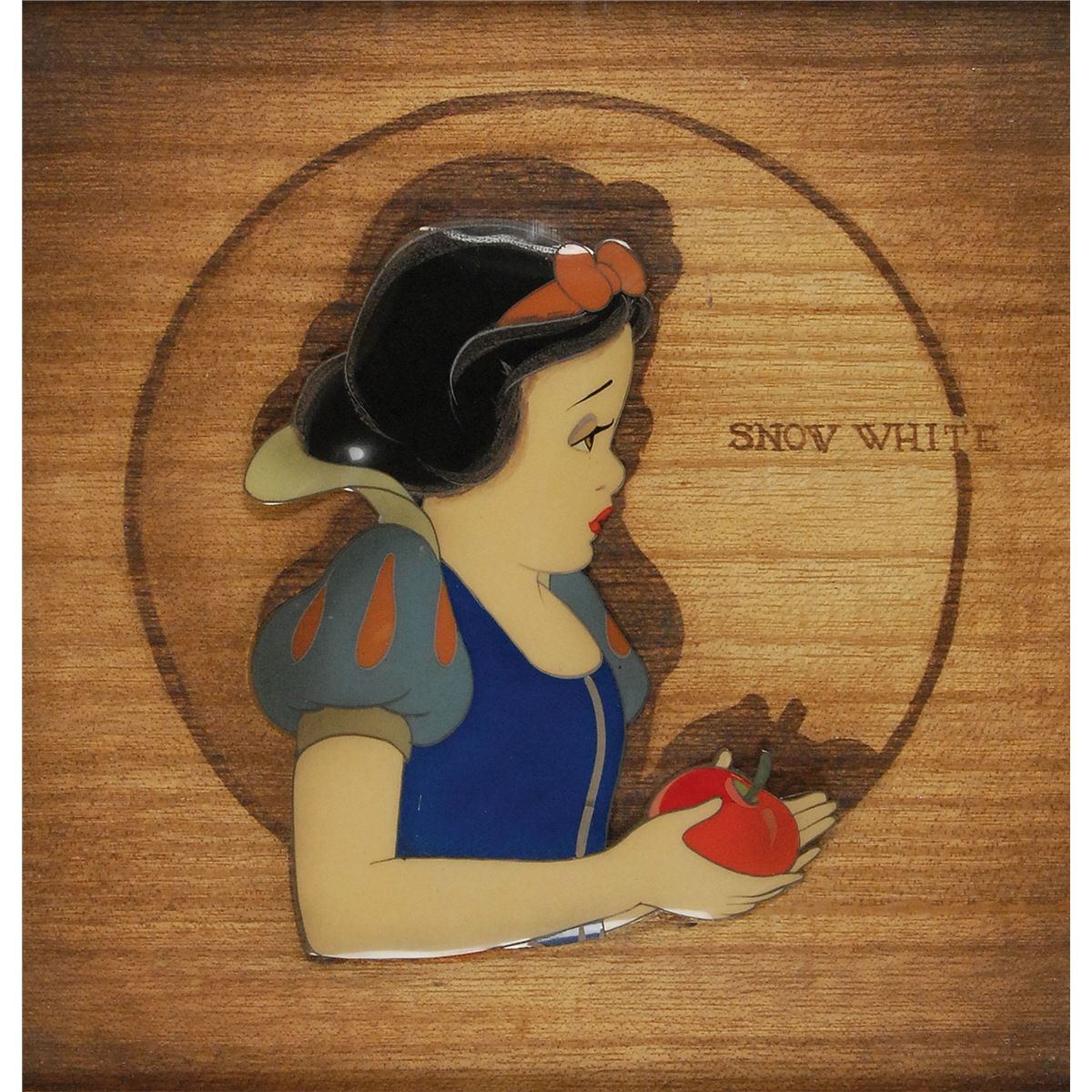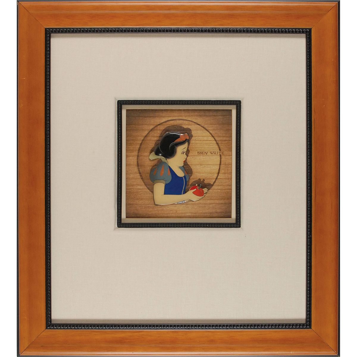 (Walt Disney Studios, 1937) Original production cel featuring Snow White from Snow White and the Seven Dwarfs, showing her in profile and holding the poison apple. The cel has been trimmed to image and applied to a woodgrain background as prepared by the Disney Studio to be sold at the Courvoisier Galleries. Image measures 3 x 3.75, with a mat opening of 5.25 x 5.5. Also framed to an overall size of 16.5 x 18. The piece has the original Disney Courvoisier Galleries label on the reverse. In fine condition. A beautiful Courvoisier woodgrain background that features her name, with an especially desirable iconic image of the princess and apple.