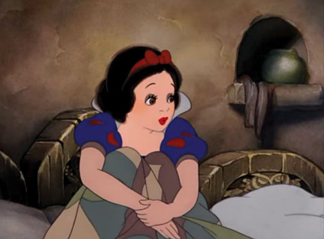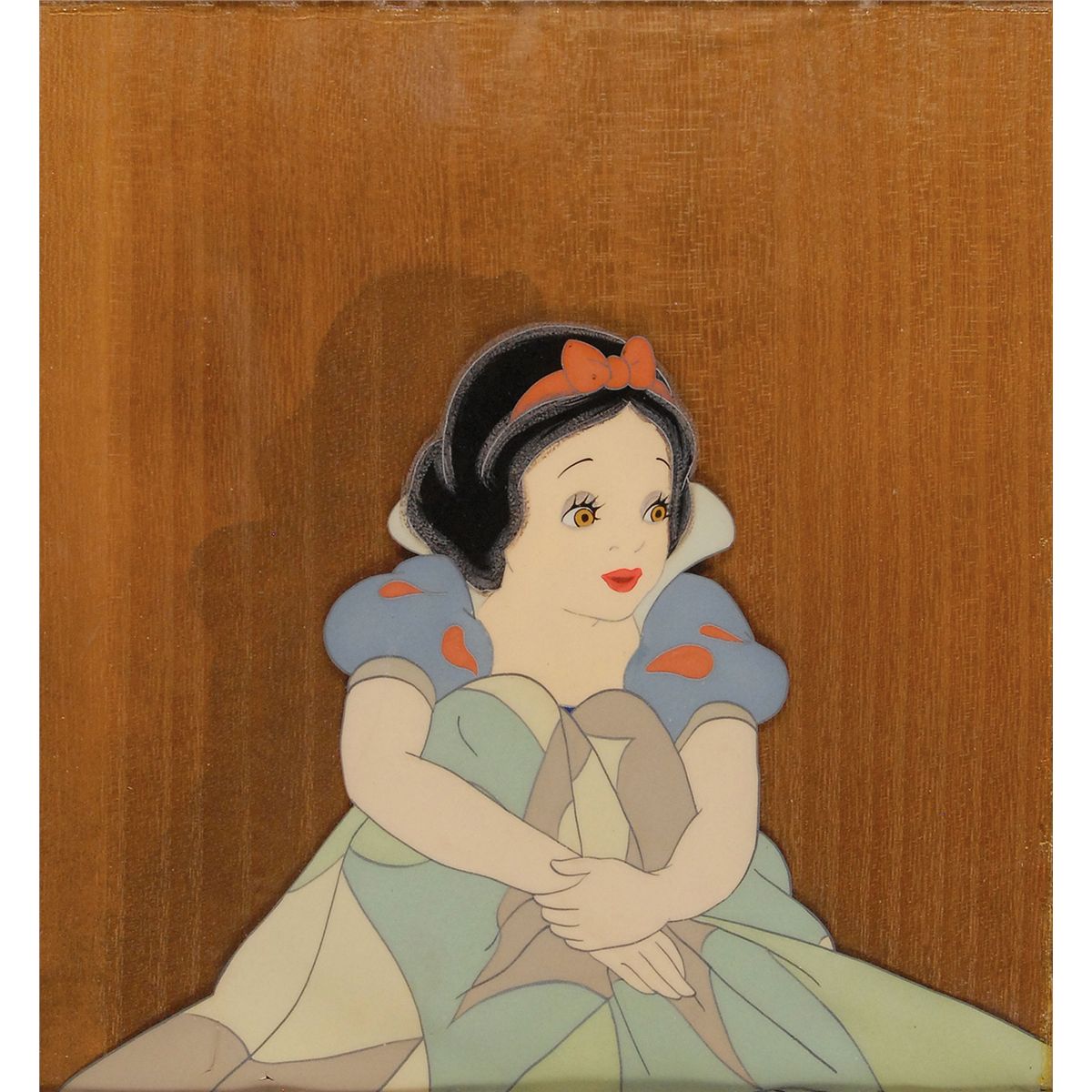 (Walt Disney Studios, 1937) Original production cel featuring Snow White from Snow White and the Seven Dwarfs. The cel has been applied to a woodgrain hand-painted background as prepared by the Disney Studio to be sold at the Courvoisier Galleries. Image of Snow White sitting in one of the dwarf’s beds measures 6.25 x 5, with a mat opening of 6.25 x 7.25, with the cream-colored mat labeled in pencil, “Snow White.” This piece is also double-cloth-matted and framed to an overall size of 17 x 19.5. The piece has the original Disney Courvoisier Galleries label on the backing of the frame. In fine condition. An exceptionally large image of Snow White from one of the film’s most endearing scenes where she wakes up and guesses each dwarf’s name based on their mannerisms.