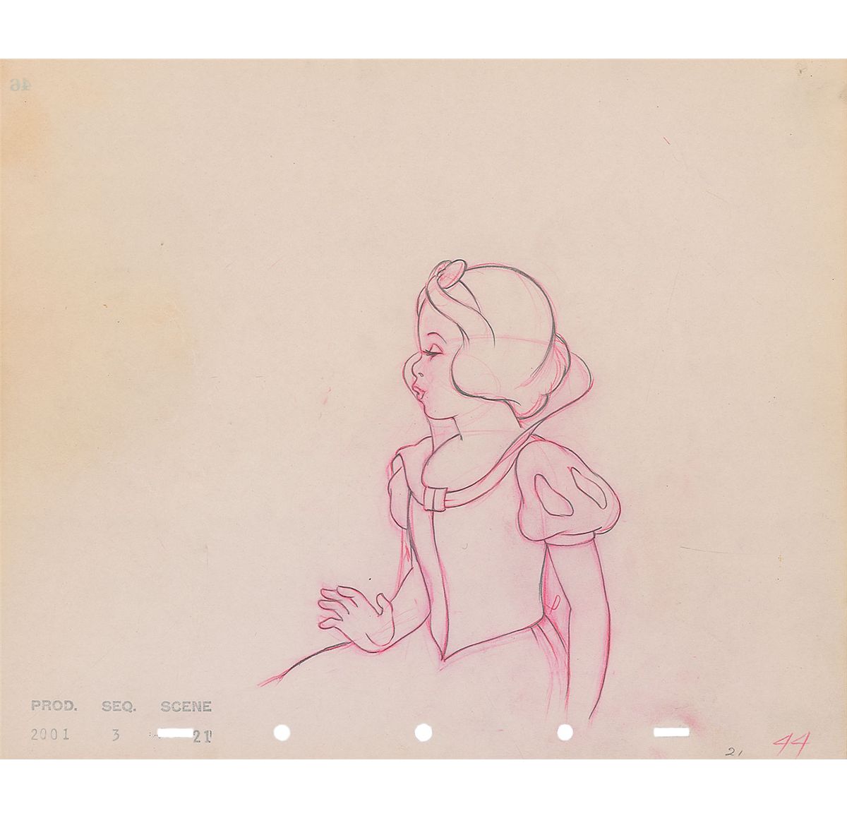 (Walt Disney Studios, 1937) Original production drawing featuring Snow White from Snow White and the Seven Dwarfs. Accomplished in red pencil and graphite on untrimmed 12 x 9.5 animation paper. The waist-up image measures 5.25 x 7. In fine condition.