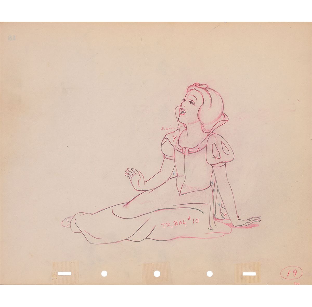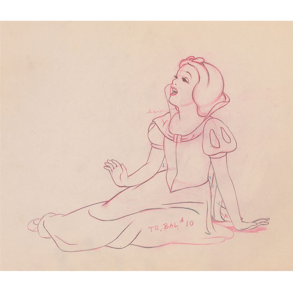 (Walt Disney Studios, 1937) Original production drawing featuring Snow White from Snow White and the Seven Dwarfs, showing her while singing with the forest animals after escaping from the huntsman. Accomplished in graphite and colored pencil on untrimmed 12 x 10 animation paper. Image measures 7.5 x 6. In fine condition.