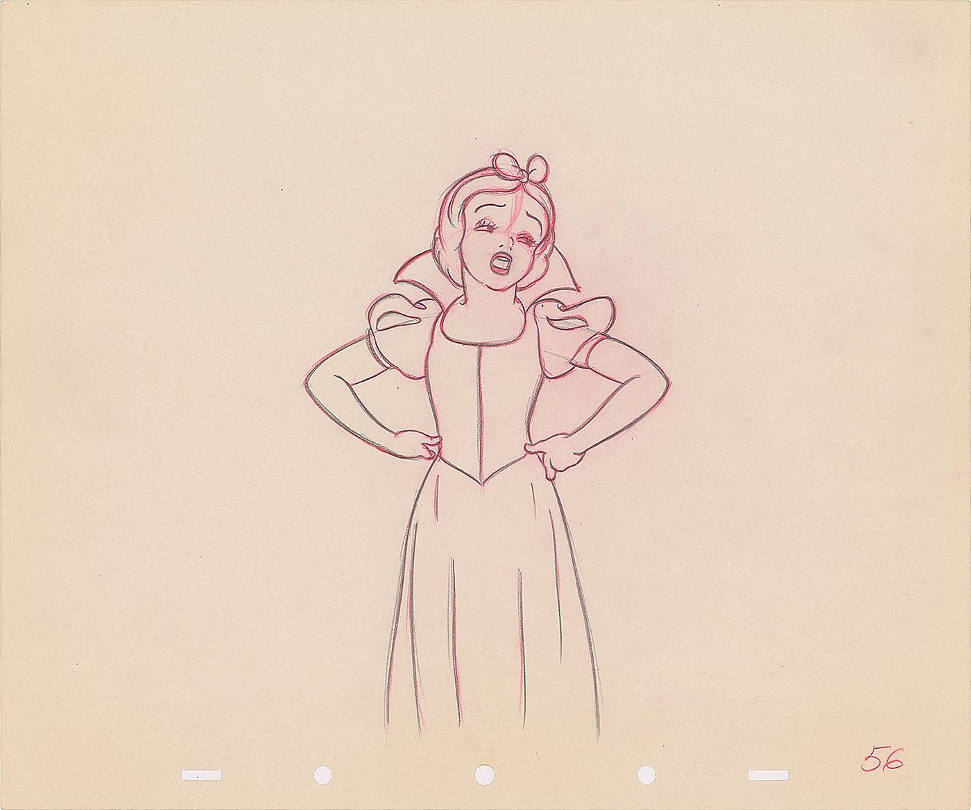 (Walt Disney Studios, 1937) Wonderful original production drawing featuring Snow White from Snow White and the Seven Dwarfs, portraying the iconic character with her hands on her hips. Accomplished in graphite and colored pencil on untrimmed 12 x 10 animation paper. Image measures 4.5 x 7. In fine condition.