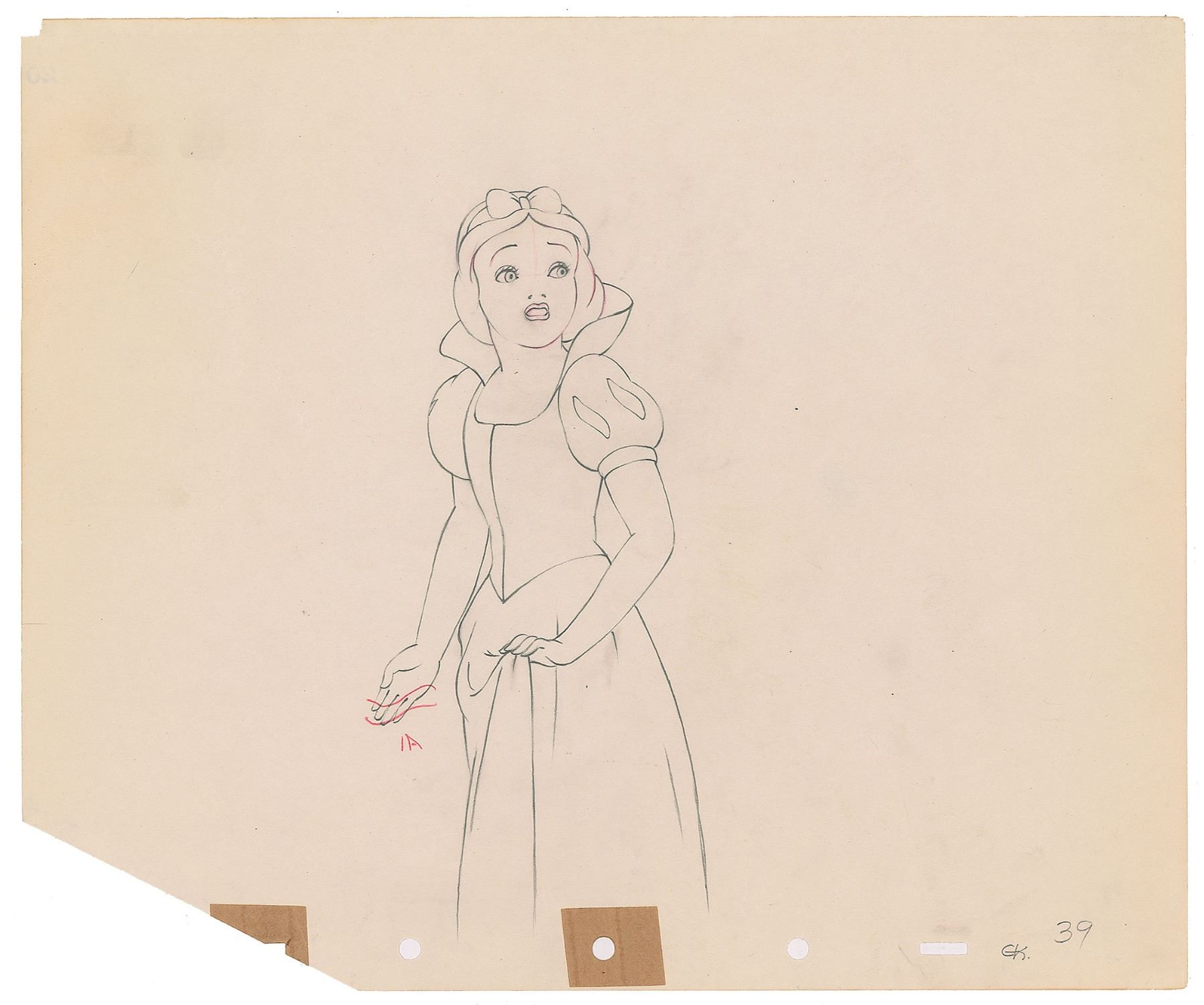 (Walt Disney Studios, 1937) Original production drawing featuring Snow White from Snow White and the Seven Dwarfs, showing her with a look of uncertainty on her face. Accomplished in graphite and colored pencil on 12 x 10 animation paper with a clipped lower left corner, marked "39" in the lower right. Image measures 3.5 x 7.5. In very good to fine condition, with a clipped lower left corner and paper loss to the upper left corner tip. A lovely, large drawing of this beloved Disney princess.