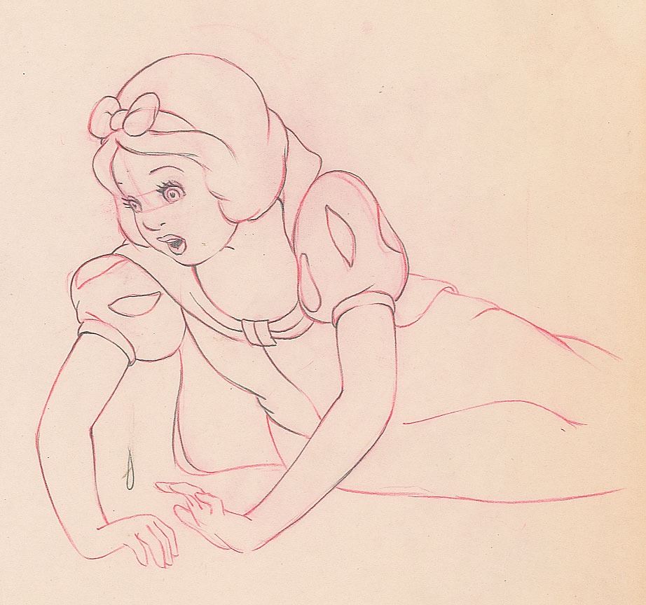 (Walt Disney Studios, 1937) Original production drawing featuring Snow White from Snow White and the Seven Dwarfs, showing her looking surprised as she wakes up in the forest. Accomplished in graphite and colored pencil on untrimmed 12 x 10 animation paper, marked "26F" in the lower right corner. Image measures 5.5 x 4.75. In fine condition.