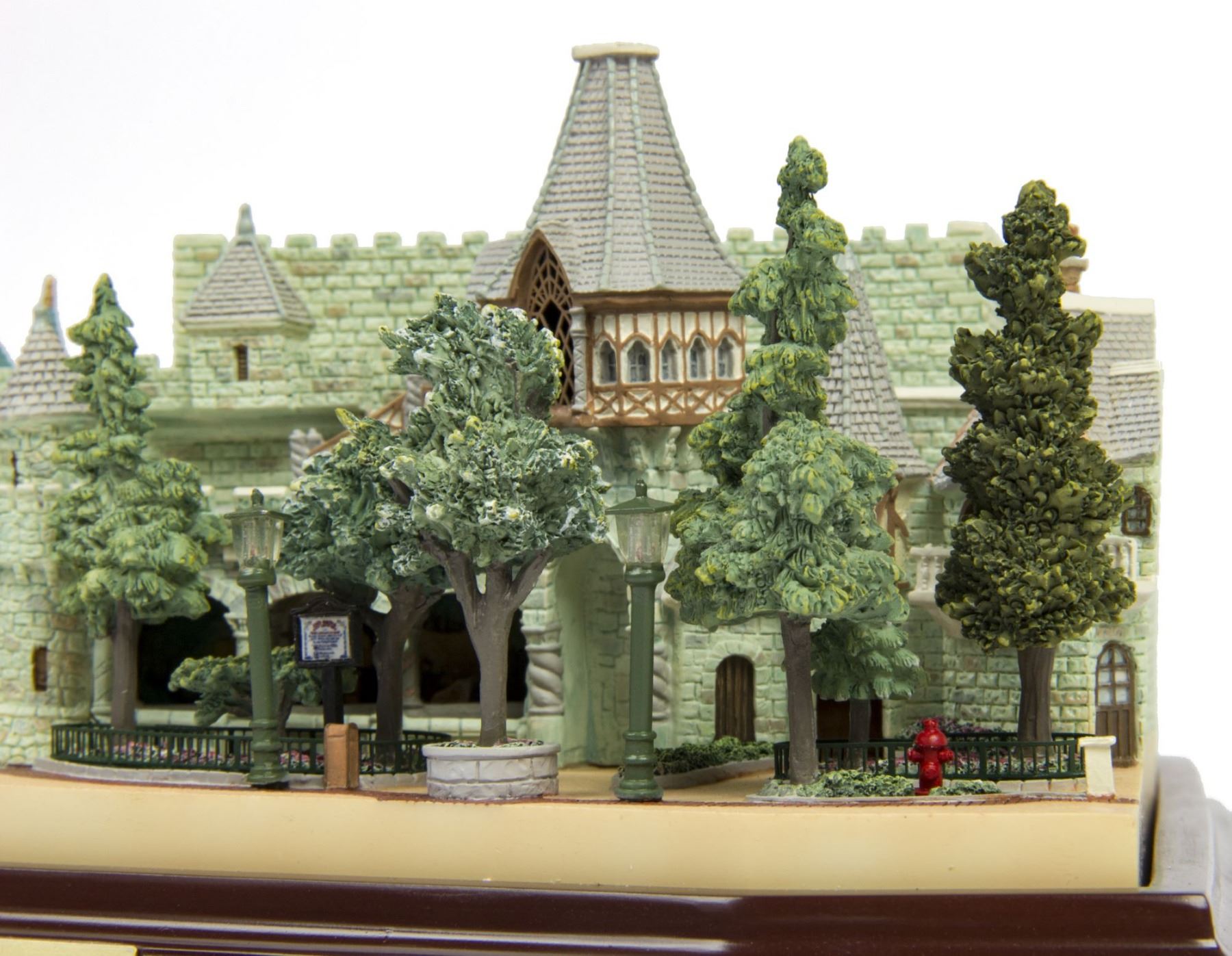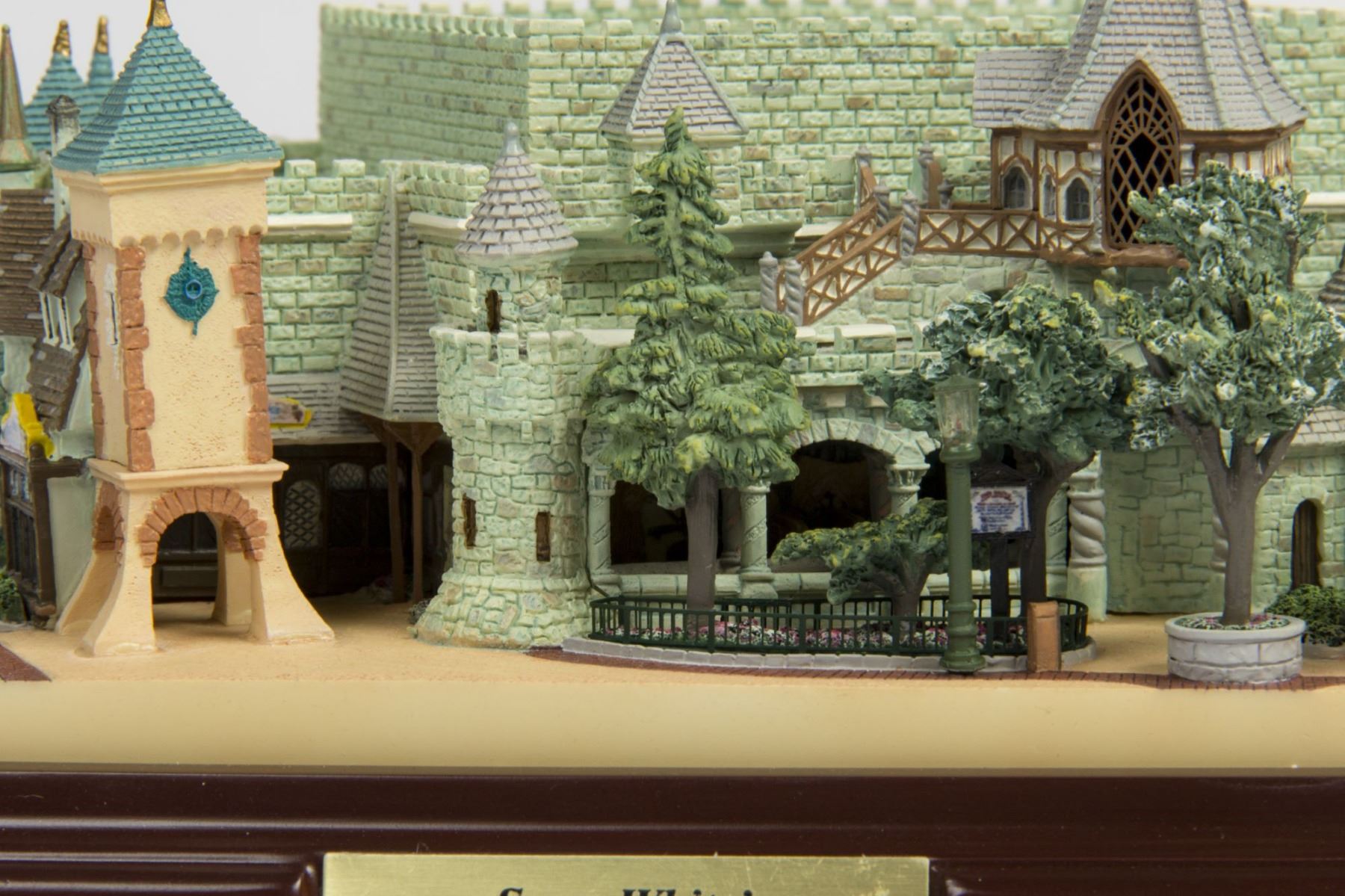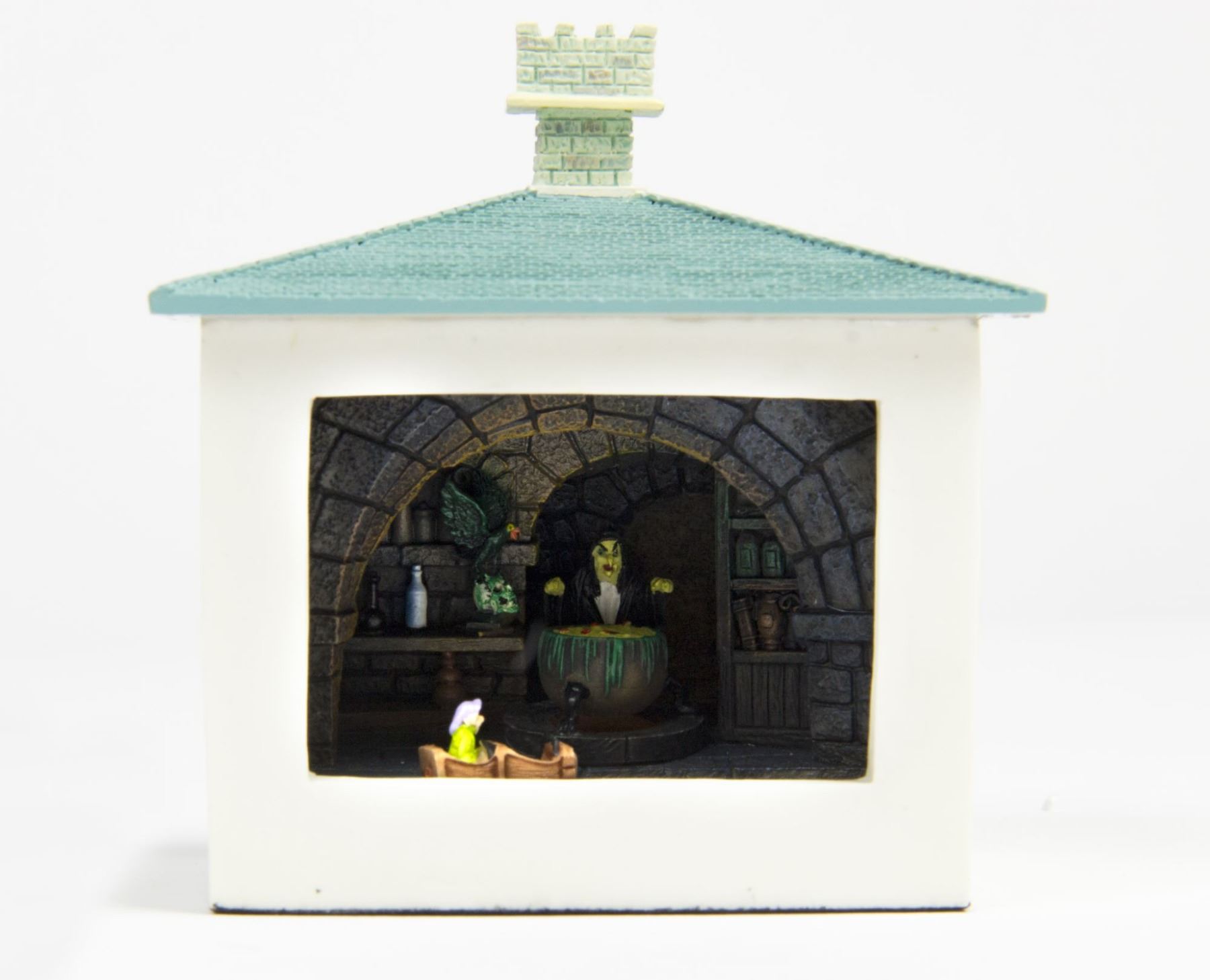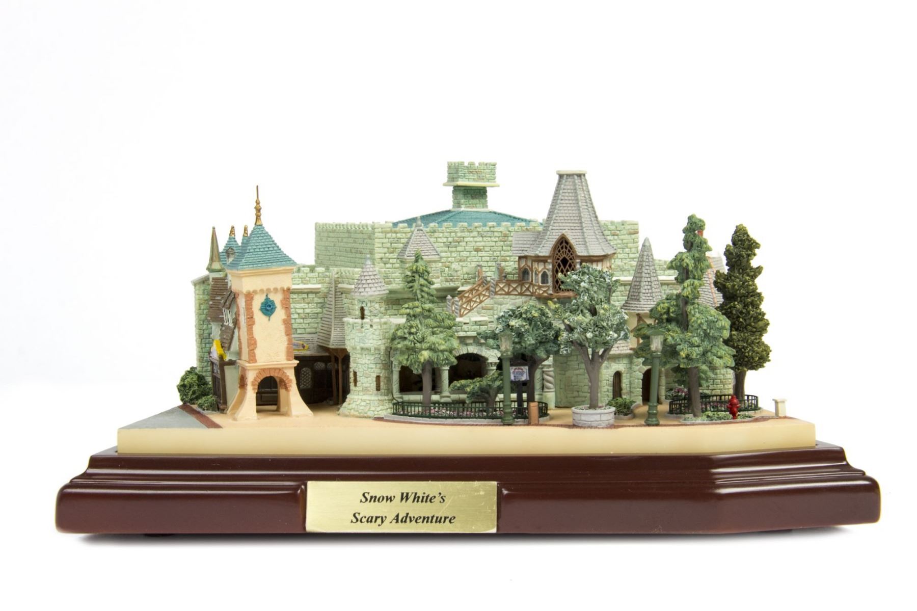 (Disneyland, 2010) An incredible miniature of Disneyland's "Snow White's Scary Adventures" attraction created by Robert Olszewski. This first edition model includes two interchangeable scenes from the attraction: the Old Hag holding the apple, and Dopey in a mine car. Measuring 8.5"x9" and 5" tall, the model is in very good condition with minor wear from previous display. The model includes the original box. Given that these miniatures have numerous fine details, there may be a small chip, crack, or break that may have gone unnoticed. Please use the images of the item to help assess the full condition.