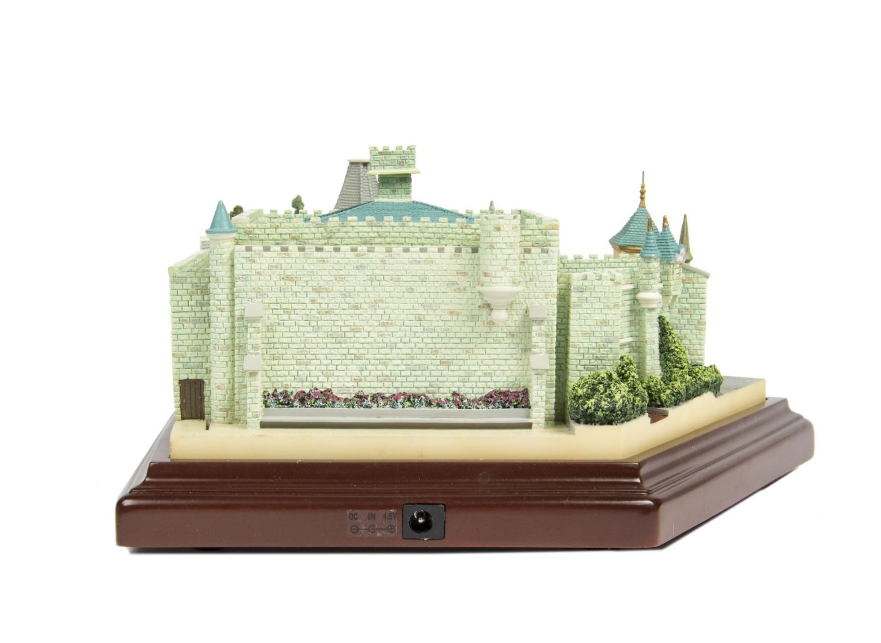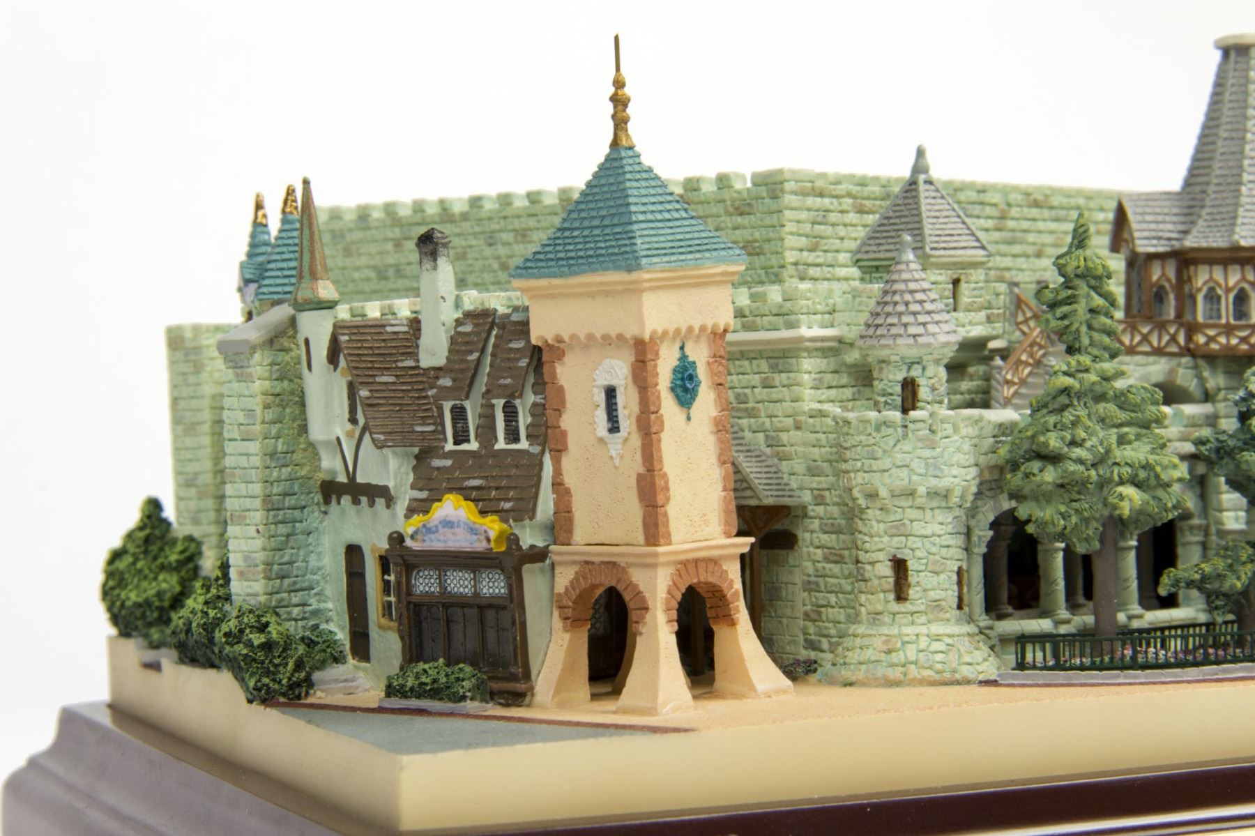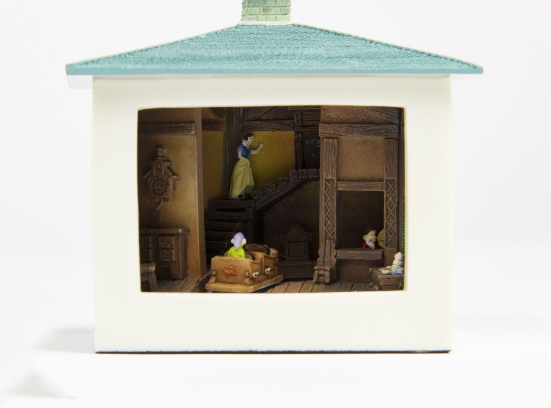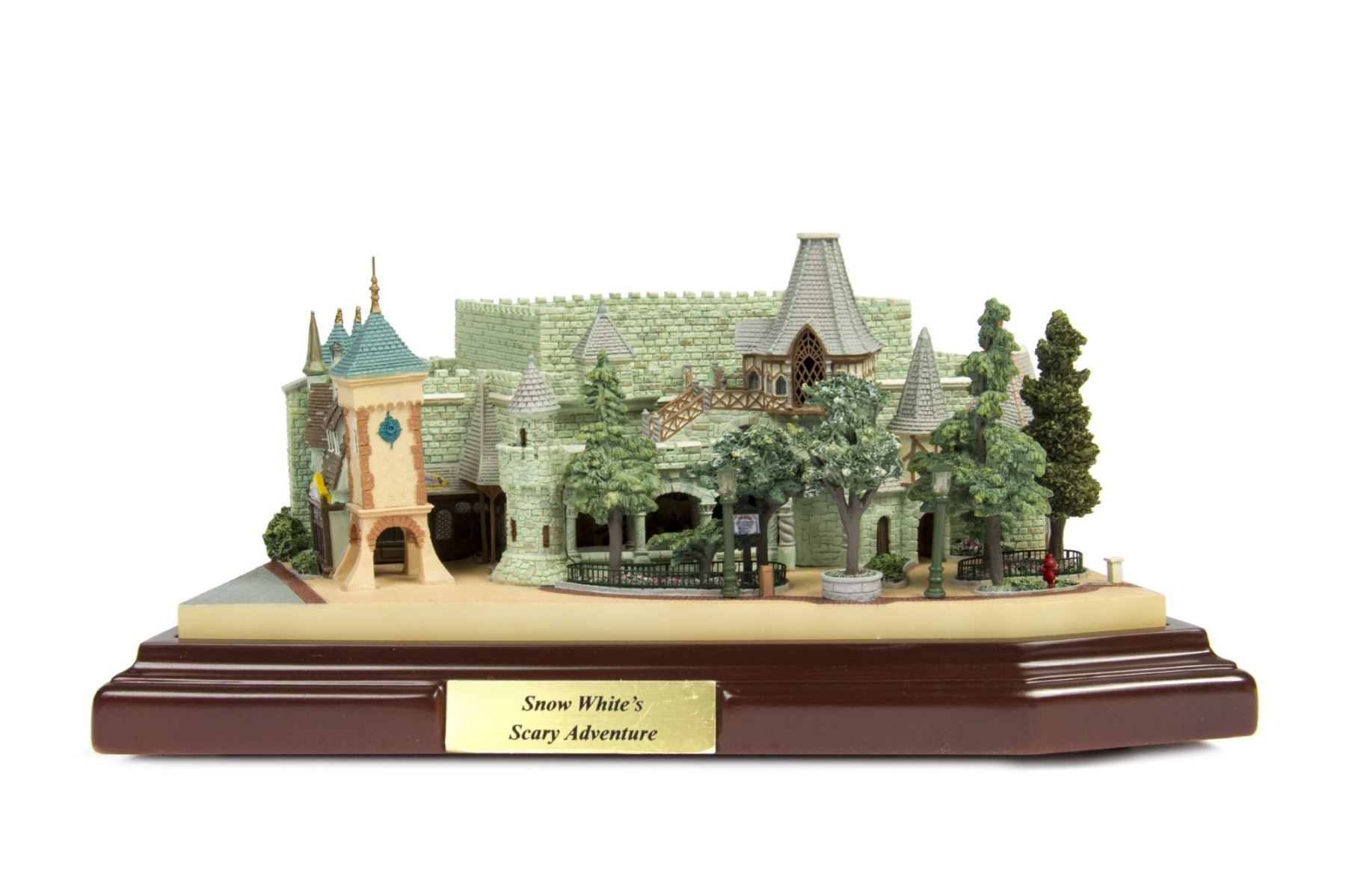(Disneyland, 2010) An incredible miniature of Disneyland's "Snow White's Scary Adventures" attraction created by Robert Olszewski. This first edition model includes two interchangeable scenes from the attraction: the Old Hag holding the apple, and Dopey in a mine car. Measuring 8.5"x9" and 5" tall, the model is in very good condition with minor wear from previous display. The model includes the original box. Given that these miniatures have numerous fine details, there may be a small chip, crack, or break that may have gone unnoticed. Please use the images of the item to help assess the full condition.