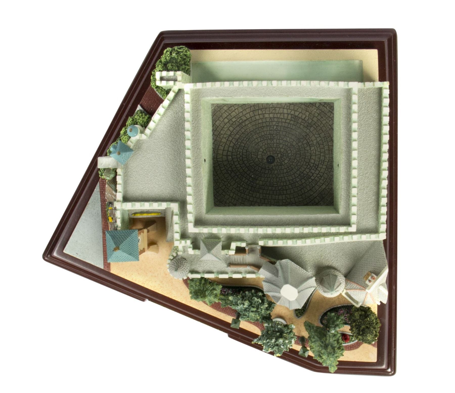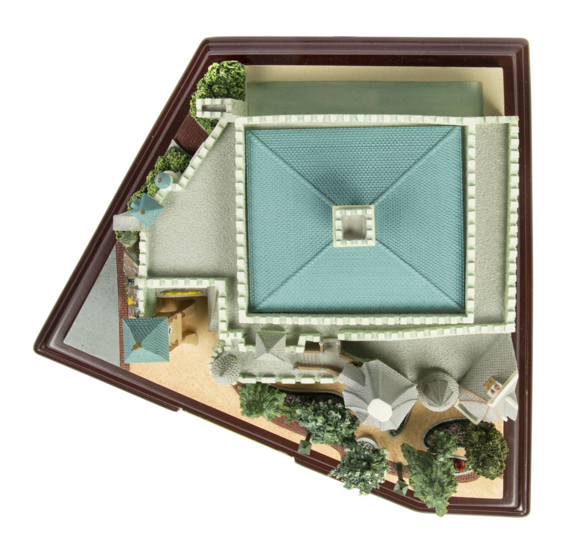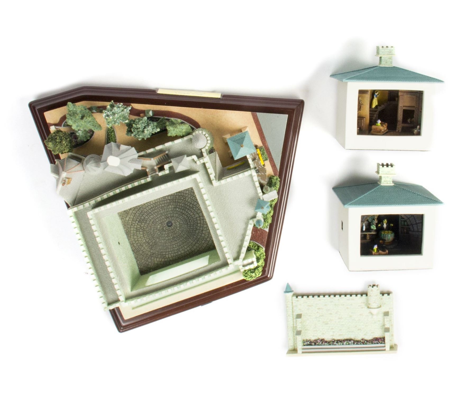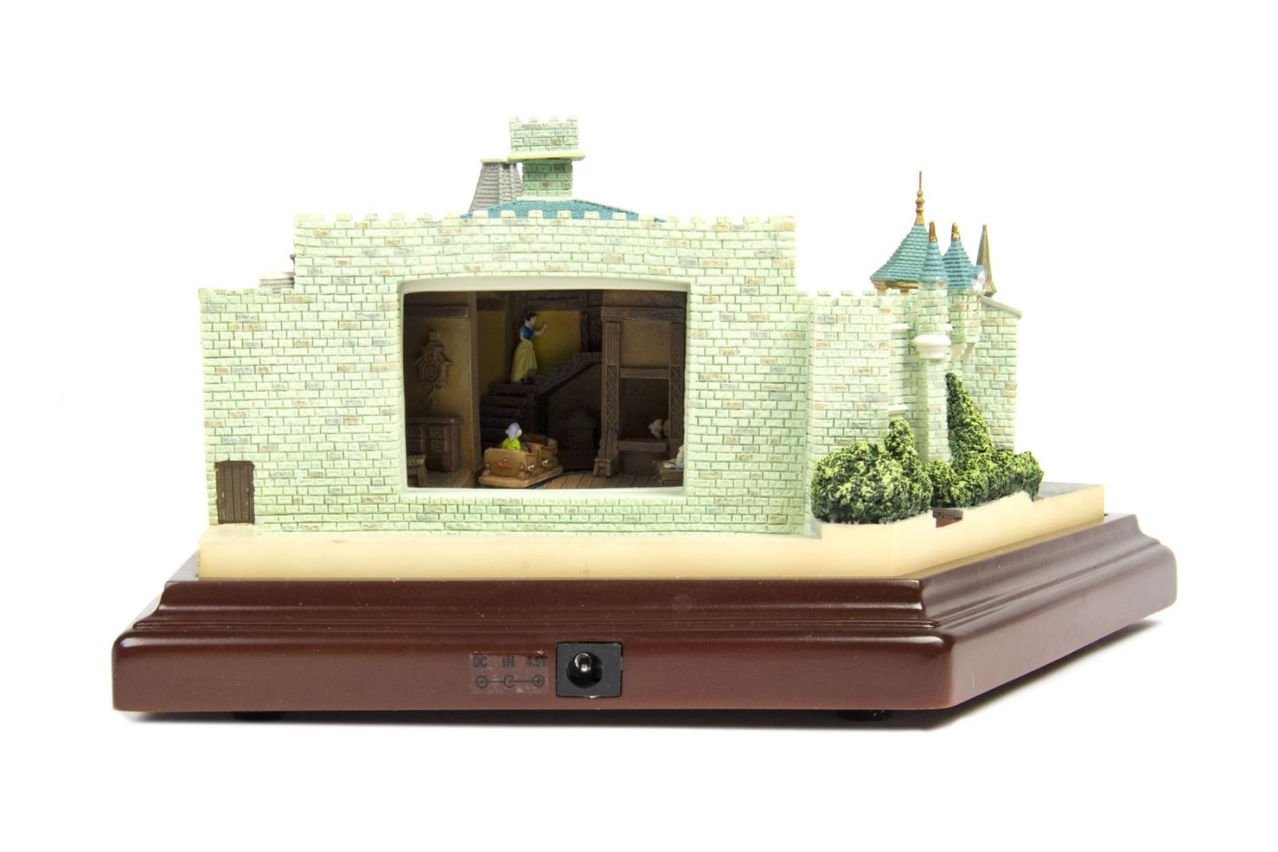(Disneyland, 2010) An incredible miniature of Disneyland's "Snow White's Scary Adventures" attraction created by Robert Olszewski. This first edition model includes two interchangeable scenes from the attraction: the Old Hag holding the apple, and Dopey in a mine car. Measuring 8.5"x9" and 5" tall, the model is in very good condition with minor wear from previous display. The model includes the original box. Given that these miniatures have numerous fine details, there may be a small chip, crack, or break that may have gone unnoticed. Please use the images of the item to help assess the full condition.
