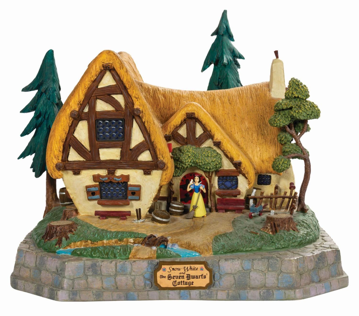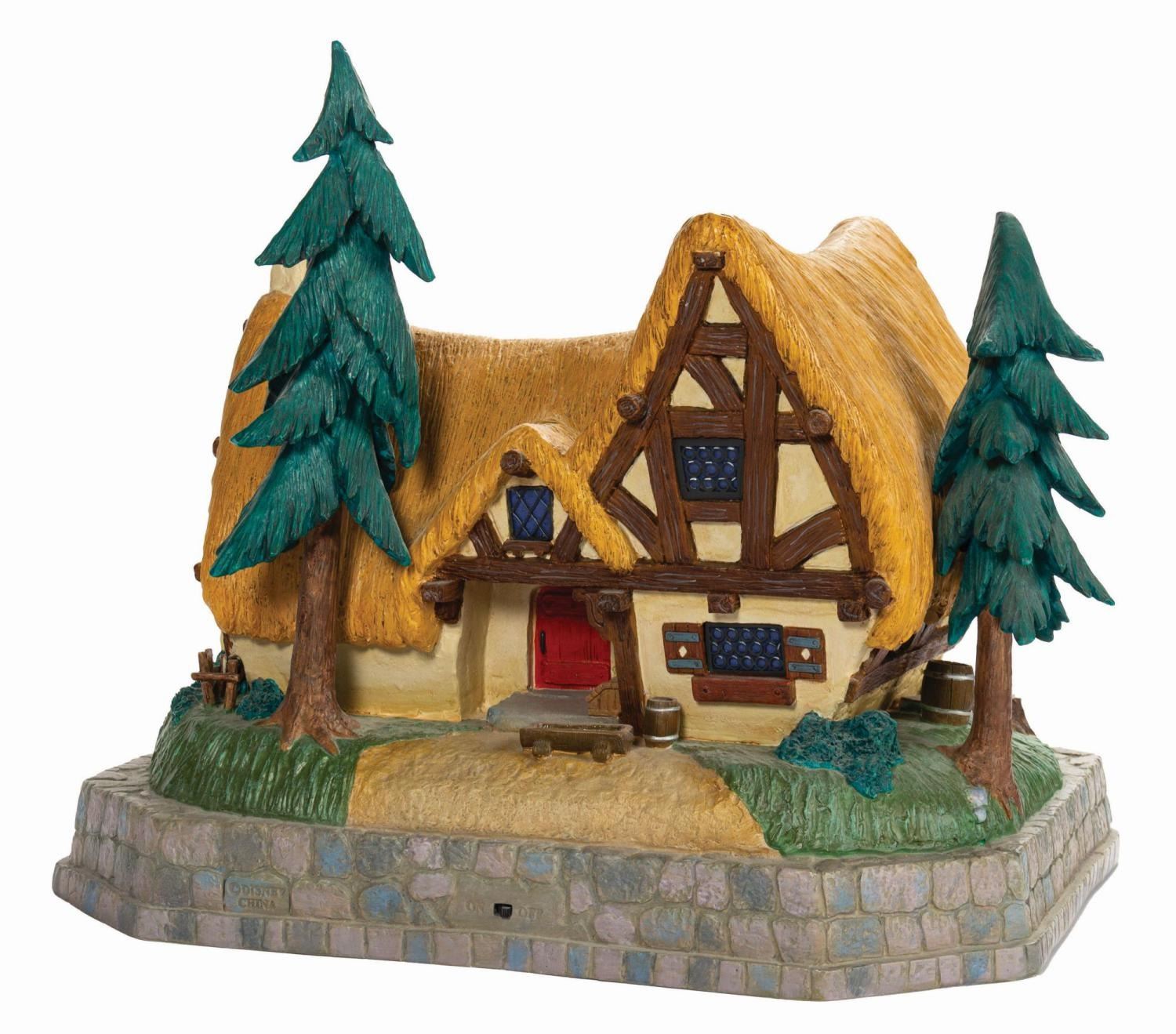 (Disney, 2004) A Snow White and the Seven Dwarfs' Cottage Magical Big Fig. There is a battery compartment in the bottom of the base and toggling a slider switch on the back illuminates the lights in every window of the house. The electronics are in working order. Measuring 13"x15" and 13.75", the piece is in very good condition with some general wear and a slightly askew broken chimney pipe. This item may require special shipping arrangements, please inquire for details and estimates.