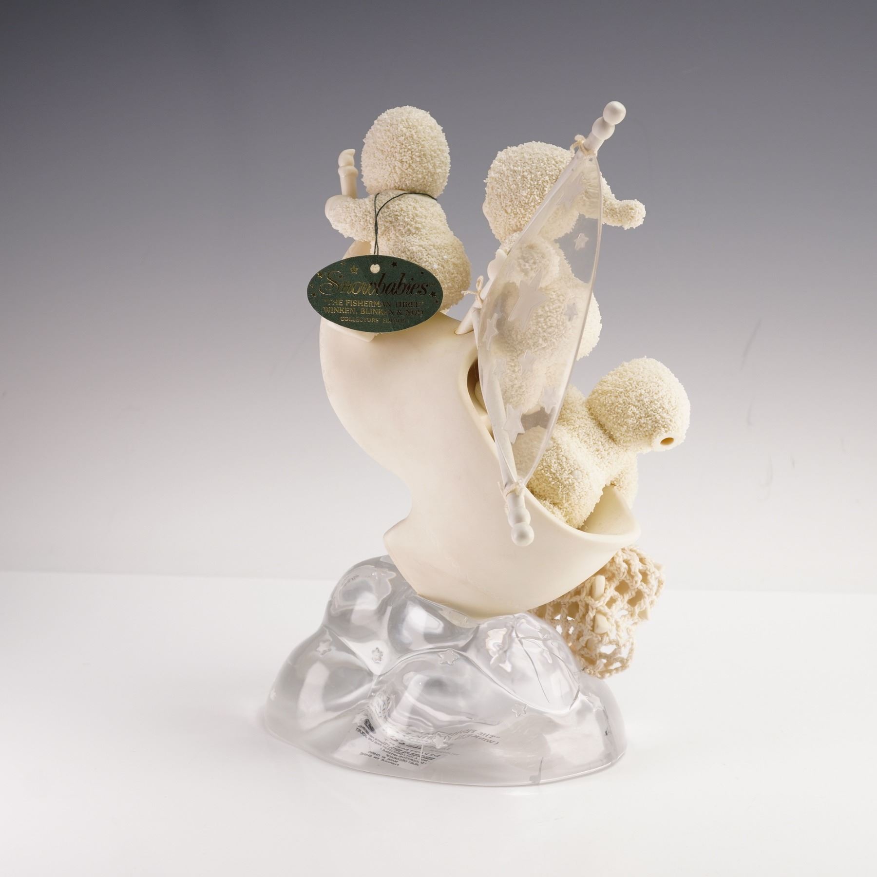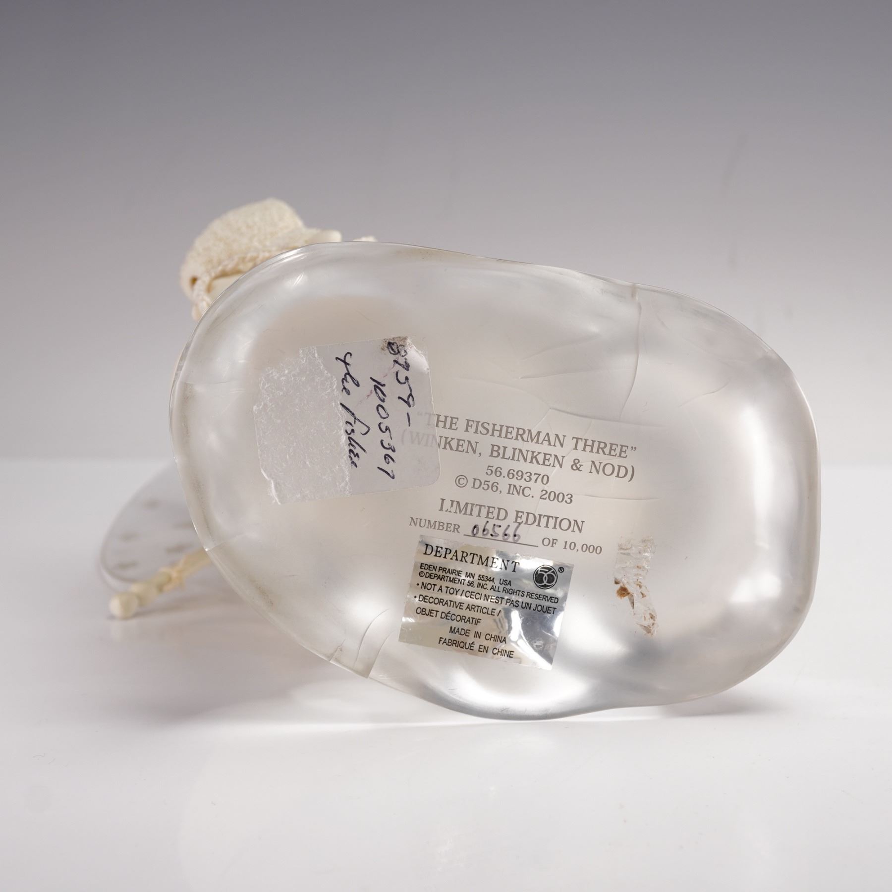 Department 56 Snowbabies porcelain figurine titled The Fisherman Three Winken, Blinken & Nod, Collectors Edition. Features three Snowbabies sailing in a crescent moon boat over a clear base with star accents. Limited Edition numbered 6566 of 10,000. Marked on base with Snowbabies and Department 56 backstamp.