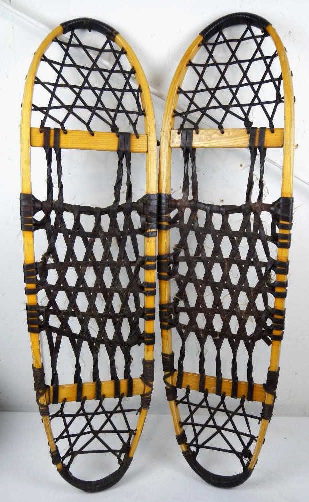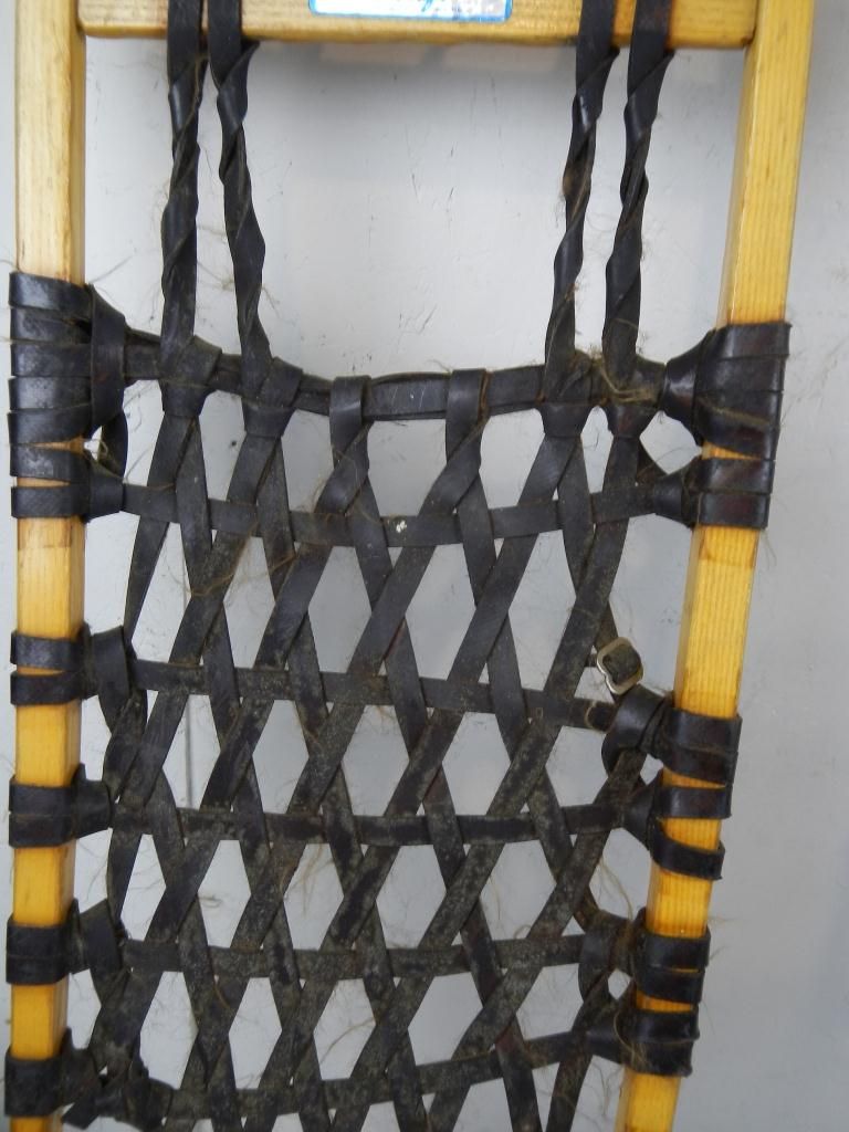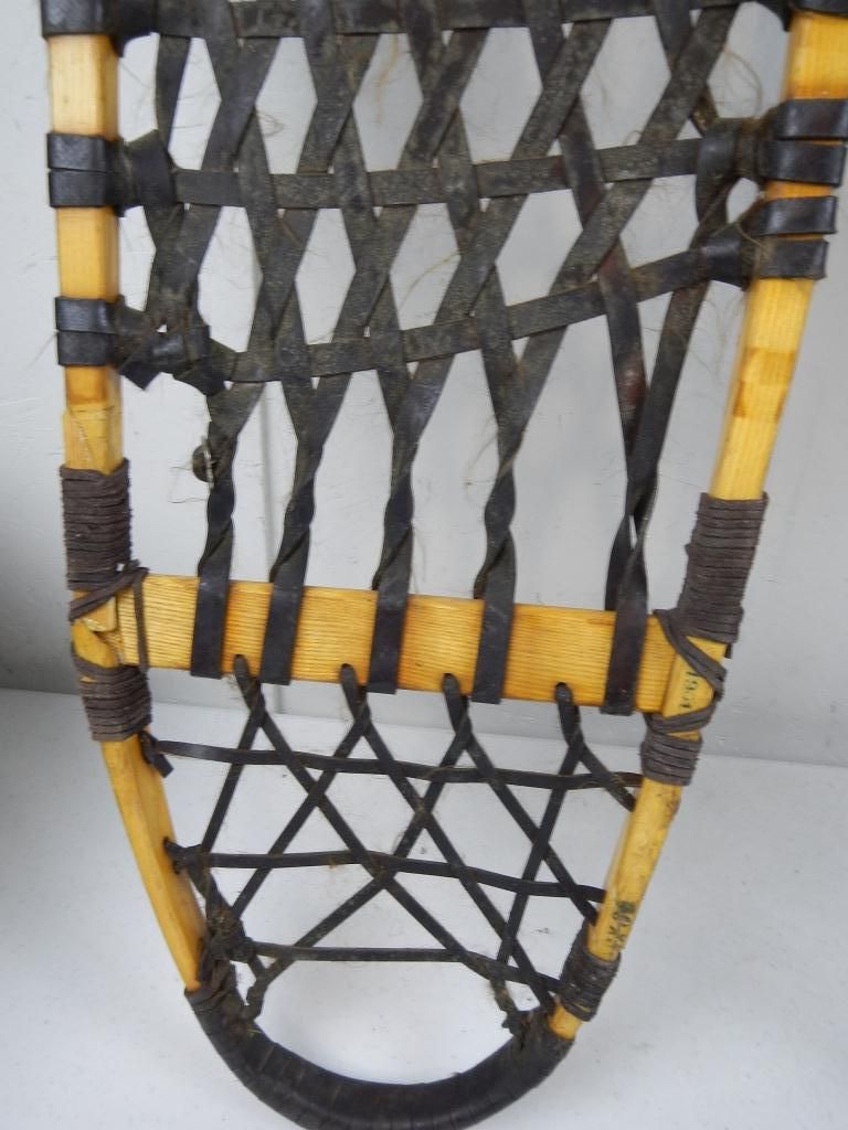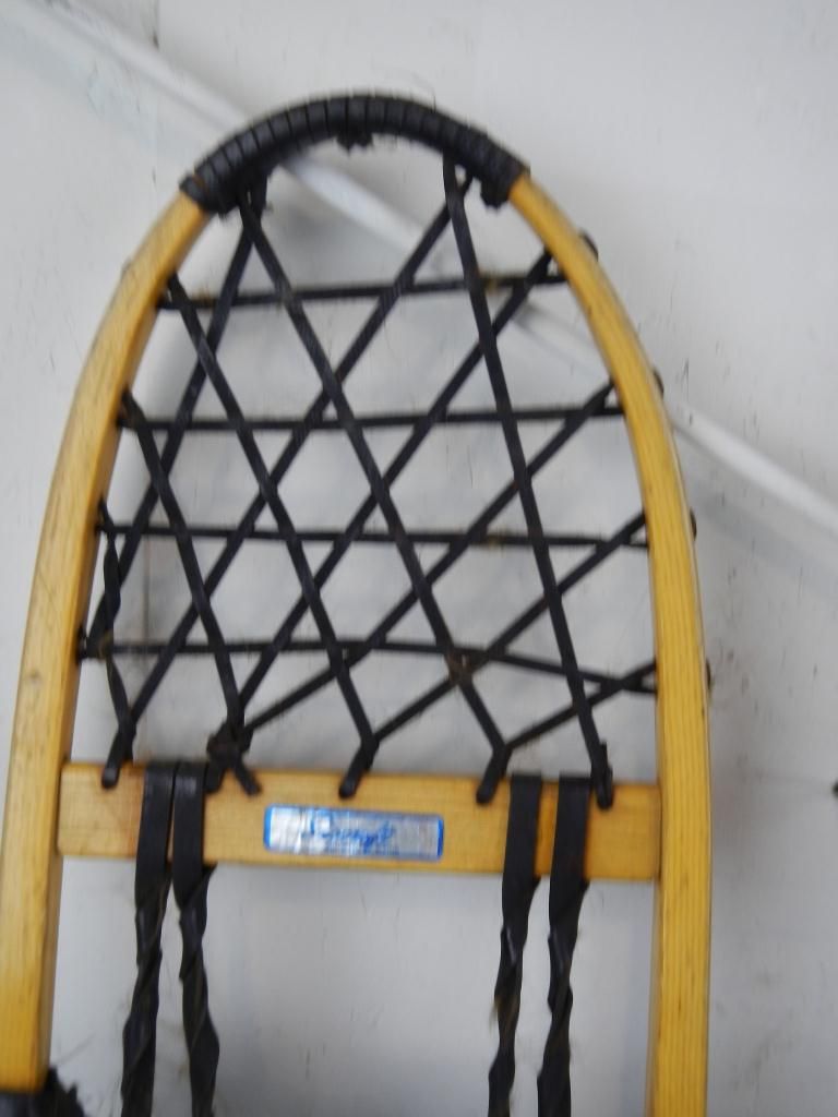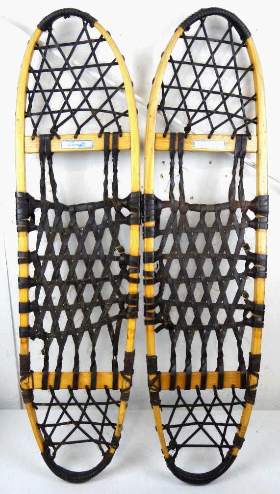 Snowcraft Snowshoes - These are a wood frame with stretched leather snowshoe. These both have the original tags and are more of the Bear Paw Shape. Made in Norway Maine. Measures 36.5"x1.25"