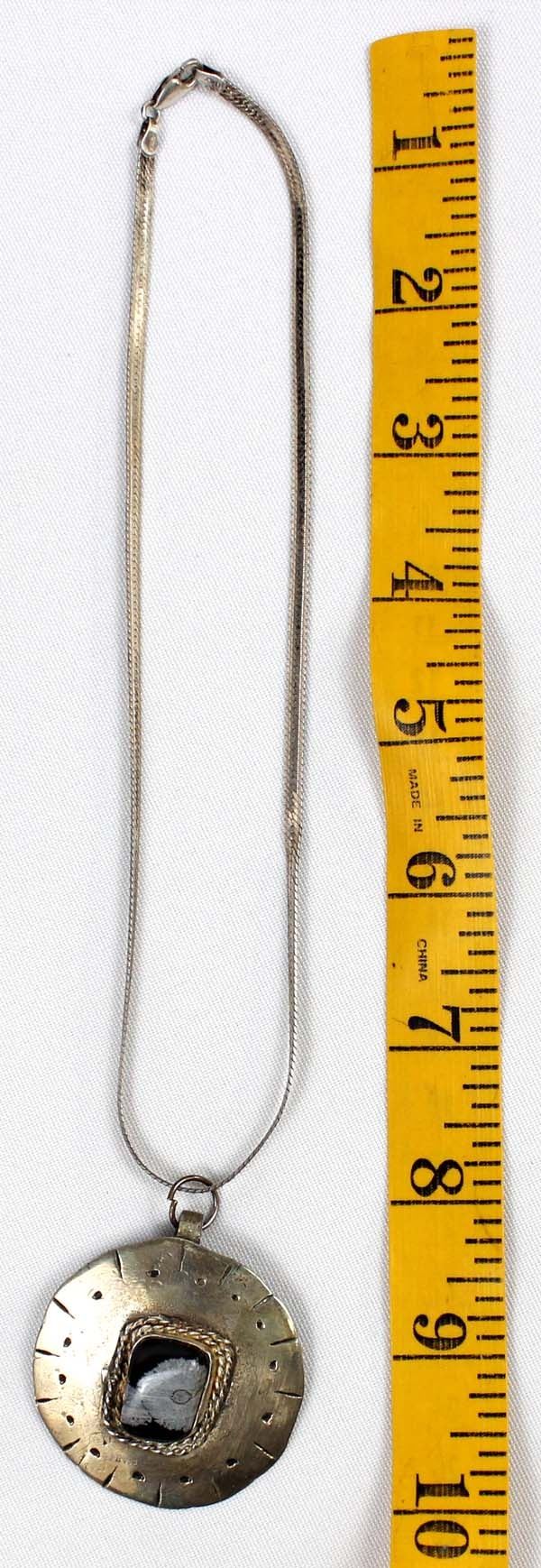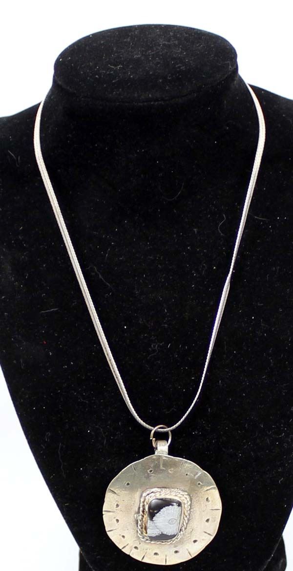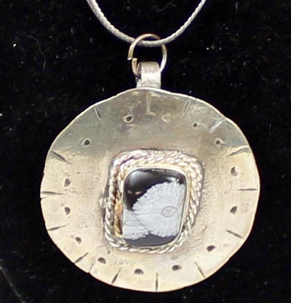 Snowflake Obsidian Pendant Necklace, the pendant is unmarked so we are unsure if it is sterling and measures 2''D, the Italian Sterling Herringbone Chain is marked and measures 15''L end to end
