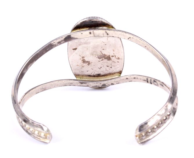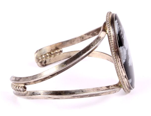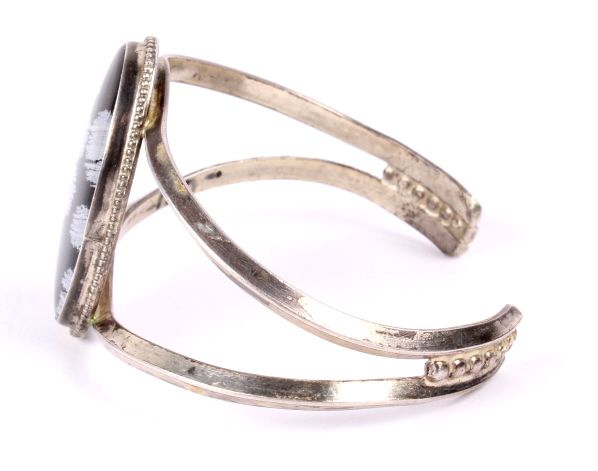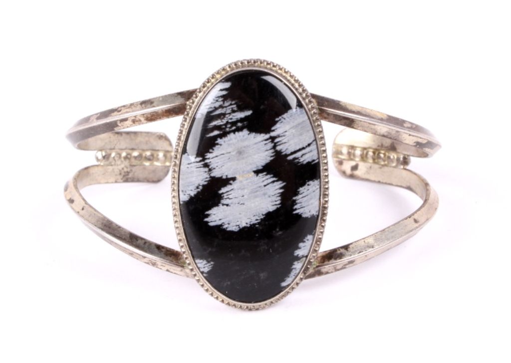 This lot features a snowflake obsidian bracelet. Obsidian is the result of a volcanic eruption. The unique "snowflake" effect is the result of gas bubbles being present during the stone's formation. Thebracelet is 2.5" x 2" with the stone being 1" x 1.75".