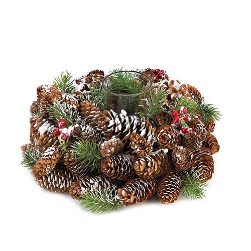 Snowy Pine Cone Wreath Candle Holder **|**|** Turn your tabletop into a wintery wonderland with this captivating centerpiece. Frosted pine cones, branches and red berries surround a single clear glass candle cup, and when you light a candle inside, it will fill the room with merry glow. Item weight: 1.6 lbs. 11-1/2 x 11-1/2" x 5-1/2" high. Pine cone, plastic and glass. Candle not included."