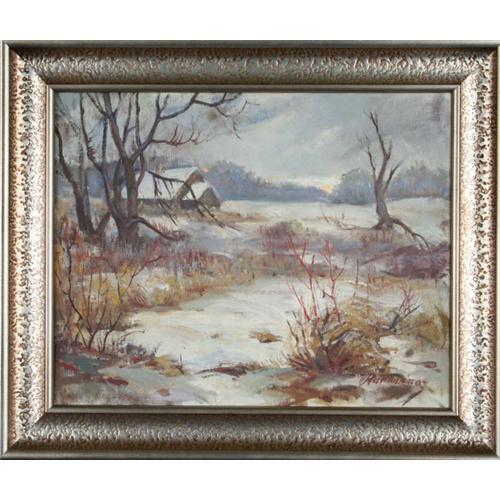 Oil on Panel landscape painting entitled ?Snowy Scene?, painted by Robert Rukavina