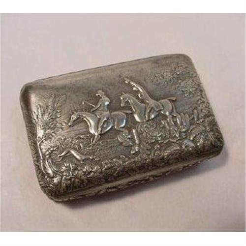 A metal snuff box, dating from the early 1800?s - the lid is embossed with scenes of riders on horseback, with hounds, in a very detailed country setting. The metal could be pewter, or nickel silver, and the box has very nice recessed detail to all sides.